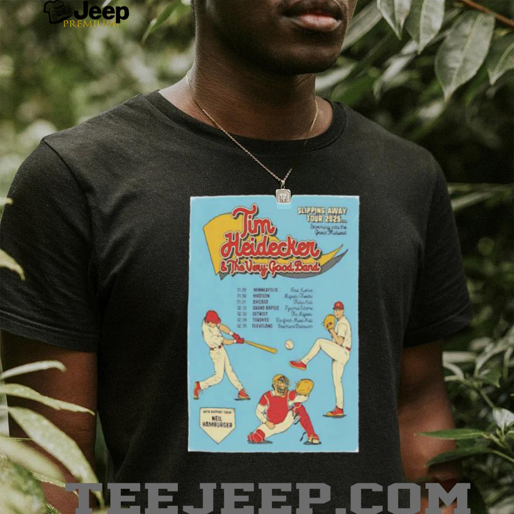 The “2025 Tim Heidecker Slipping Away Tour Midwest Poster shirt” is a specific piece of merchandise created to celebrate the Midwest stops of Tim Heidecker’s “Slipping Away Tour” in 2025. This shirt likely features a design directly inspired by the promotional posters used for the Midwest dates of the tour. It serves as a memento for fans who attended shows in this region or for those who appreciate the tour’s aesthetic and want a unique item related to those specific performances. The design would prominently display “2025 Tim Heidecker Slipping Away Tour” along with imagery and potentially the dates and cities of the Midwest shows.