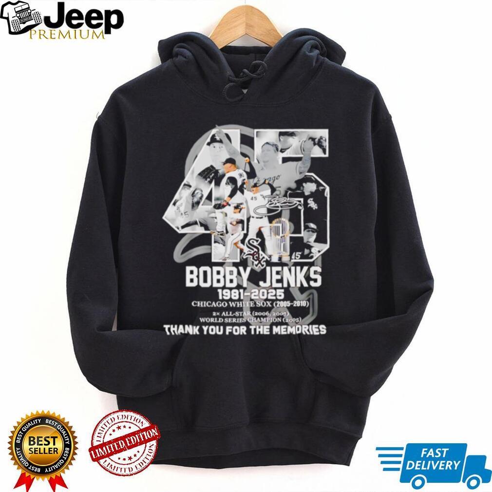 The “45 Bobby Jenks 1981-2025 Chicago White Sox thank you for the memories” shirt is a heartfelt tribute to one of the most impactful closers in Chicago White Sox history. This shirt commemorates Bobby Jenks, celebrating his life (1981-2025) and expressing gratitude for the indelible memories he created, particularly during the White Sox’s memorable 2005 World Series championship run. It’s a poignant piece of fan apparel that honors a player who was central to a golden era for the South Siders, allowing fans to reflect on his contributions and the thrilling moments he delivered.