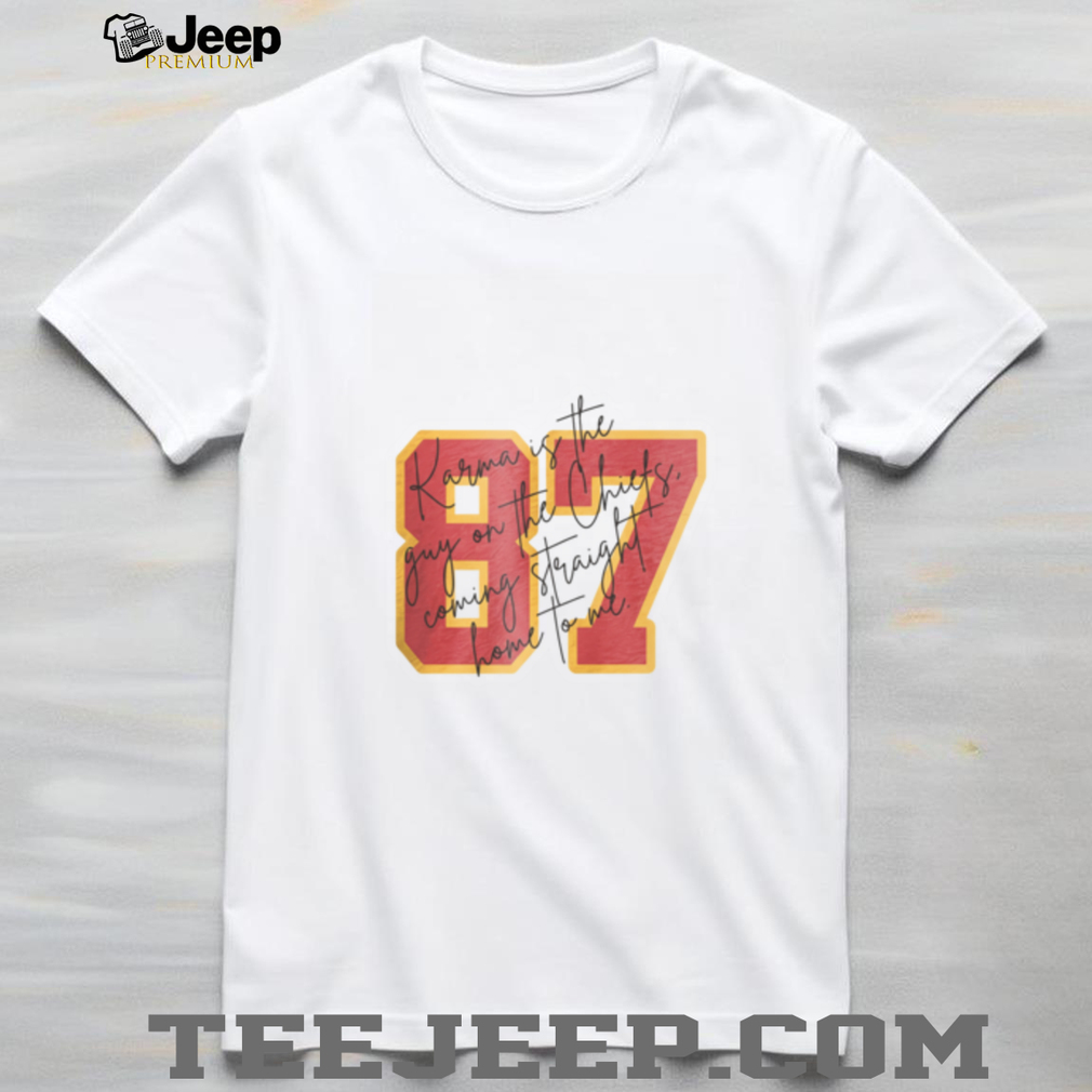 The “87 Karma Is The Guy T Shirt” is perfect for individuals who enjoy a touch of philosophy and humor in their wardrobe. This T-shirt is great for casual gatherings, a day out with friends, or even just relaxing at home. It makes an excellent gift for anyone who appreciates witty apparel, believes in good vibes, or has a special connection to the number 87. It’s a versatile and memorable addition to any casual collection, inviting compliments and questions. See how it looks on, in this second image: