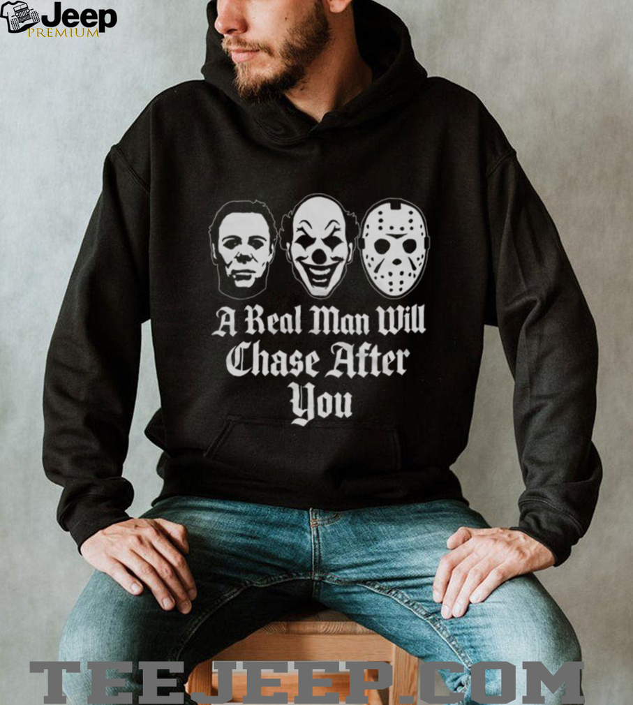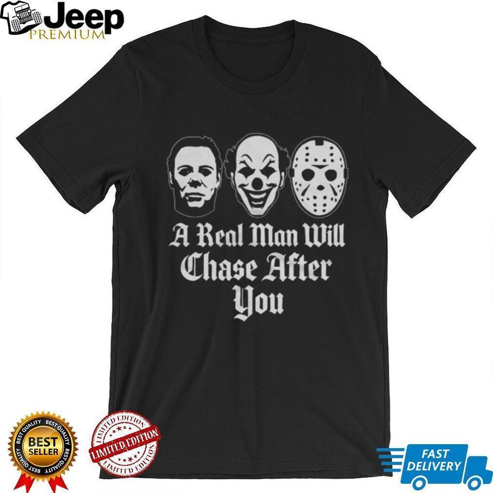 ()A Real Man Will Chase After You Horror Movie Slasher T Shirt, Treat yourself or make a great gift for your loved ones