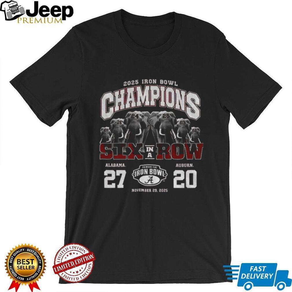 Relive the thrill of victory with this “Alabama Crimson Tide Beat Auburn Tigers 2025 Iron Bowl Champions six in a row shirt!” This tee commemorates the Crimson Tide’s latest triumph over their rivals and lets you proudly display your team allegiance. If you’re an Alabama fan, this is a must-have to celebrate the Iron Bowl win.