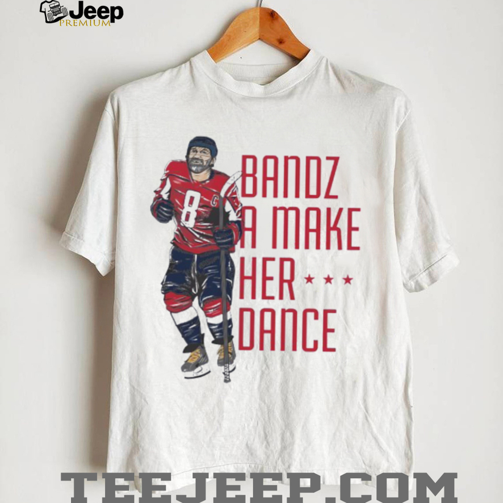 The design of this shirt would likely incorporate elements that represent both hockey and hip-hop. Expect to see the Washington Capitals logo and team colors (red, white, and blue), alongside imagery related to Alexander Ovechkin, such as his silhouette, his jersey number, or a stylized representation of him playing hockey. The phrase “Bandz A Make Her Dance” would be displayed in a font that reflects hip-hop culture, possibly with bold lettering or a graffiti-inspired style. The overall aesthetic aims to be energetic and playful, capturing the unexpected fusion of these two cultural realms. The design seeks to visually represent the crossover between hockey and hip hop.