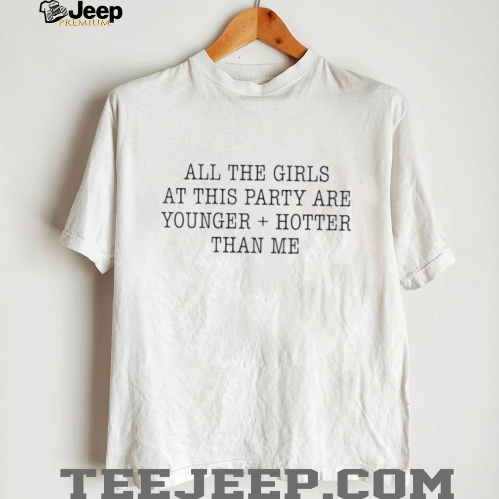 The “All the girls at this party are younger and hotter than me shirt” uses self-deprecating humor to address the common experience of feeling out of place at a social gathering. It acknowledges the inevitable passage of time and the often-humorous contrast between generations. The shirt aims to create a sense of relatability and shared experience, allowing the wearer to acknowledge their age with a touch of irony. It’s a statement that embraces vulnerability and turns a potentially awkward situation into a comedic observation.