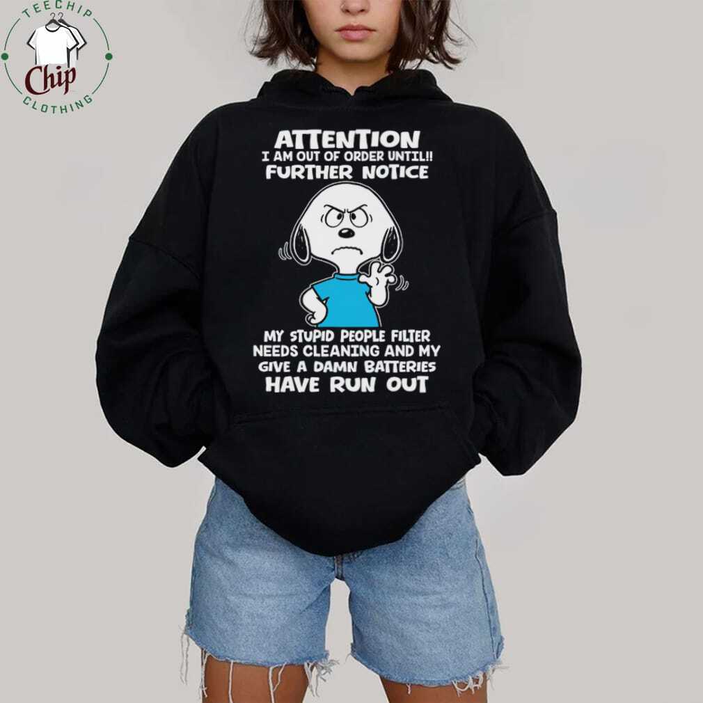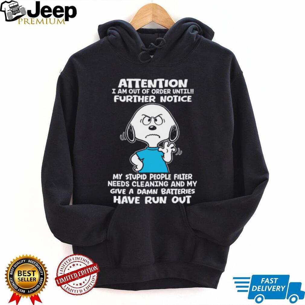 Attention I Am Out Of Order Until!! Further Notice My Stupid People Filter Needs Cleaning And My Give A Damn Batteries Have Run Out Snoopy Shirt, Treat yourself or make a great gift for your loved ones