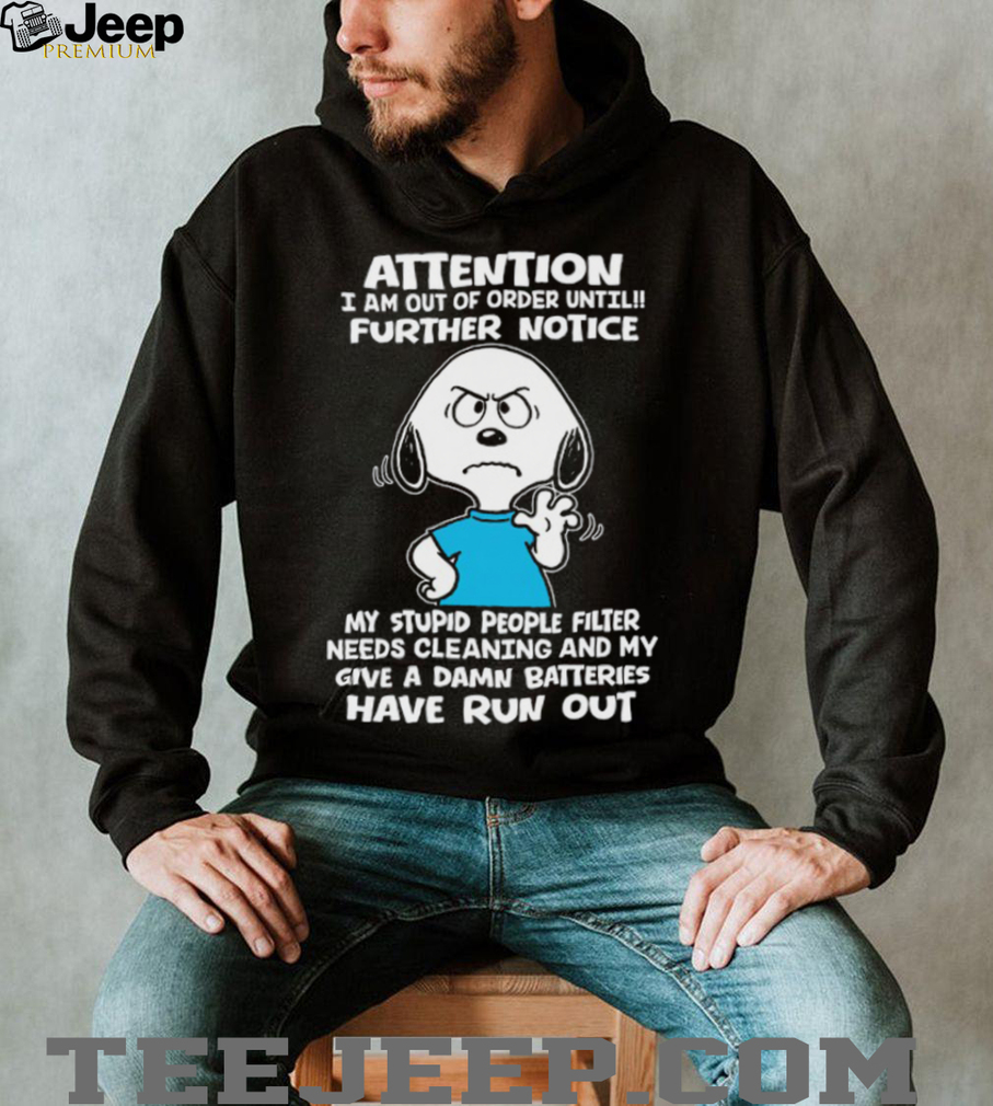 👕 About Attention I Am Out Of Order Until!! Further Notice My Stupid People Filter Needs Cleaning And My Give A Damn Batteries Have Run Out Snoopy Shirt