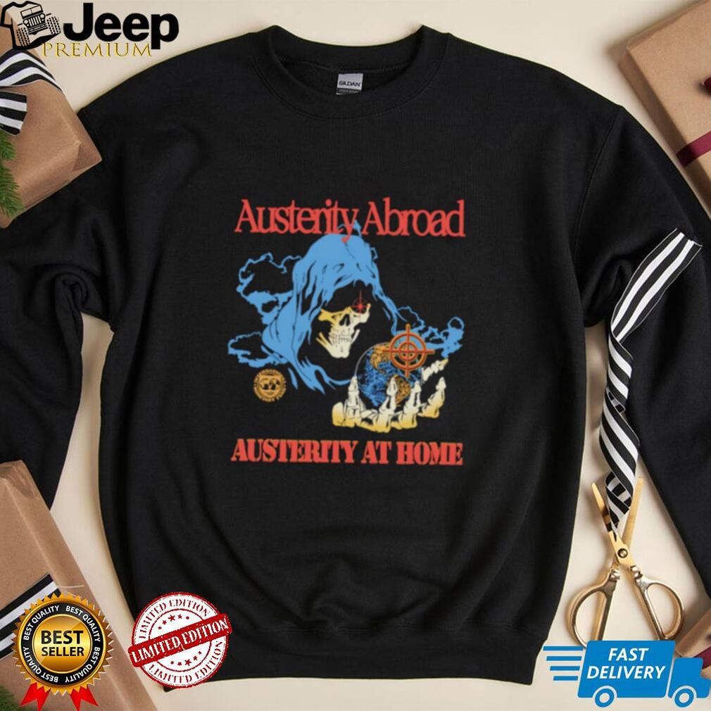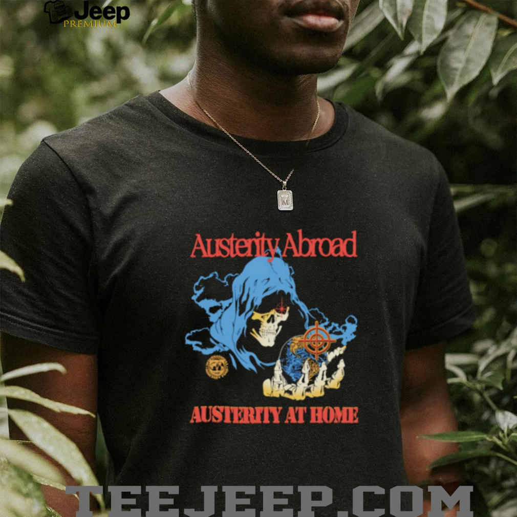 The continuous debate around “**austerity**” and its effects, both “**abroad**” and “**at home**,” ensures the enduring relevance of this shirt’s message. As global economies face various challenges, discussions about government spending, national debt, and social welfare are ever-present. This shirt taps into a critical ongoing dialogue about how societies manage their resources and prioritize the well-being of their citizens.
