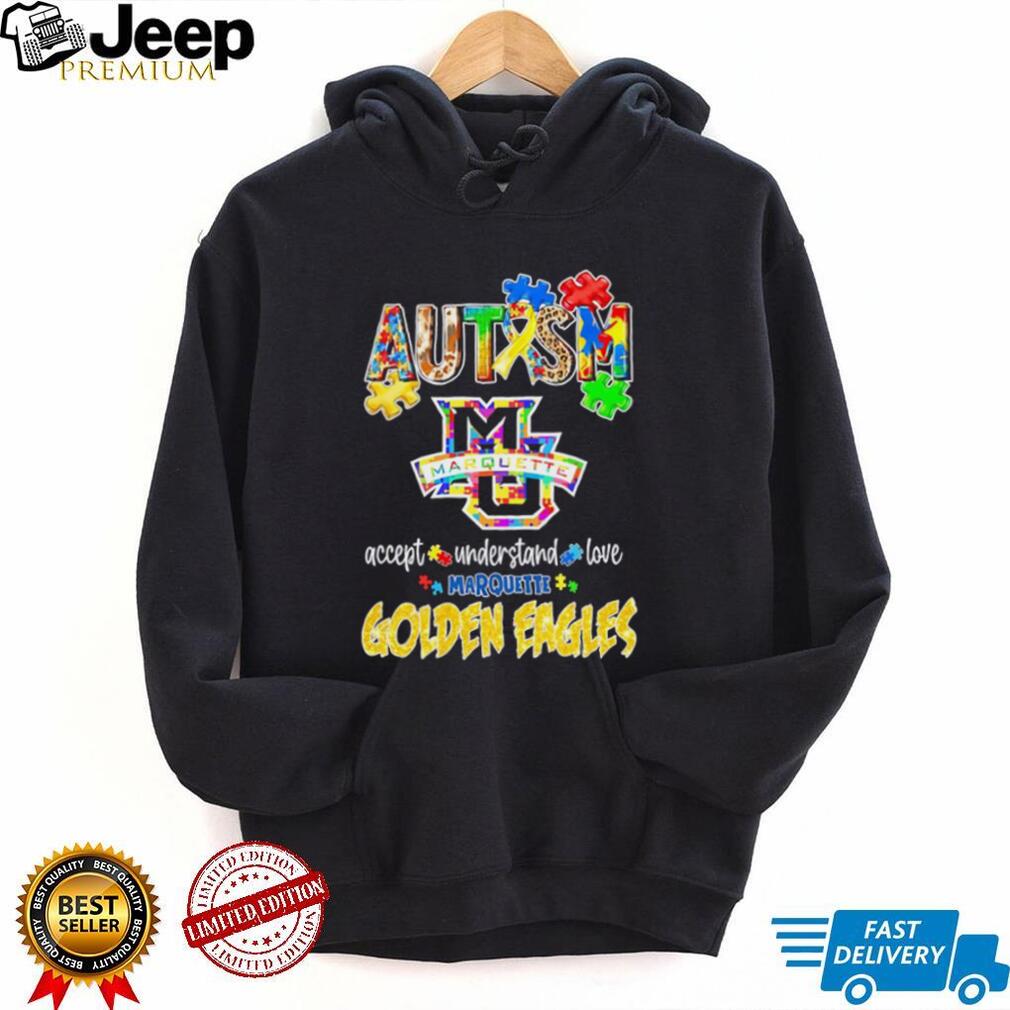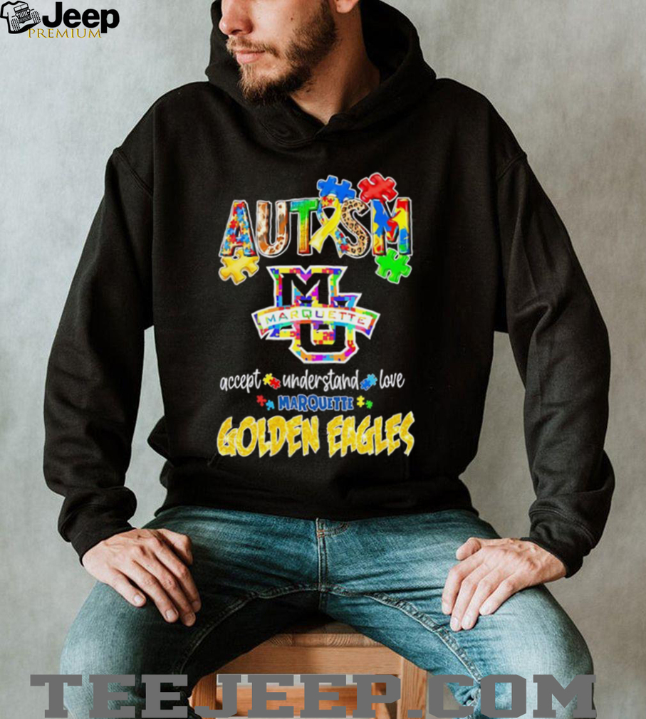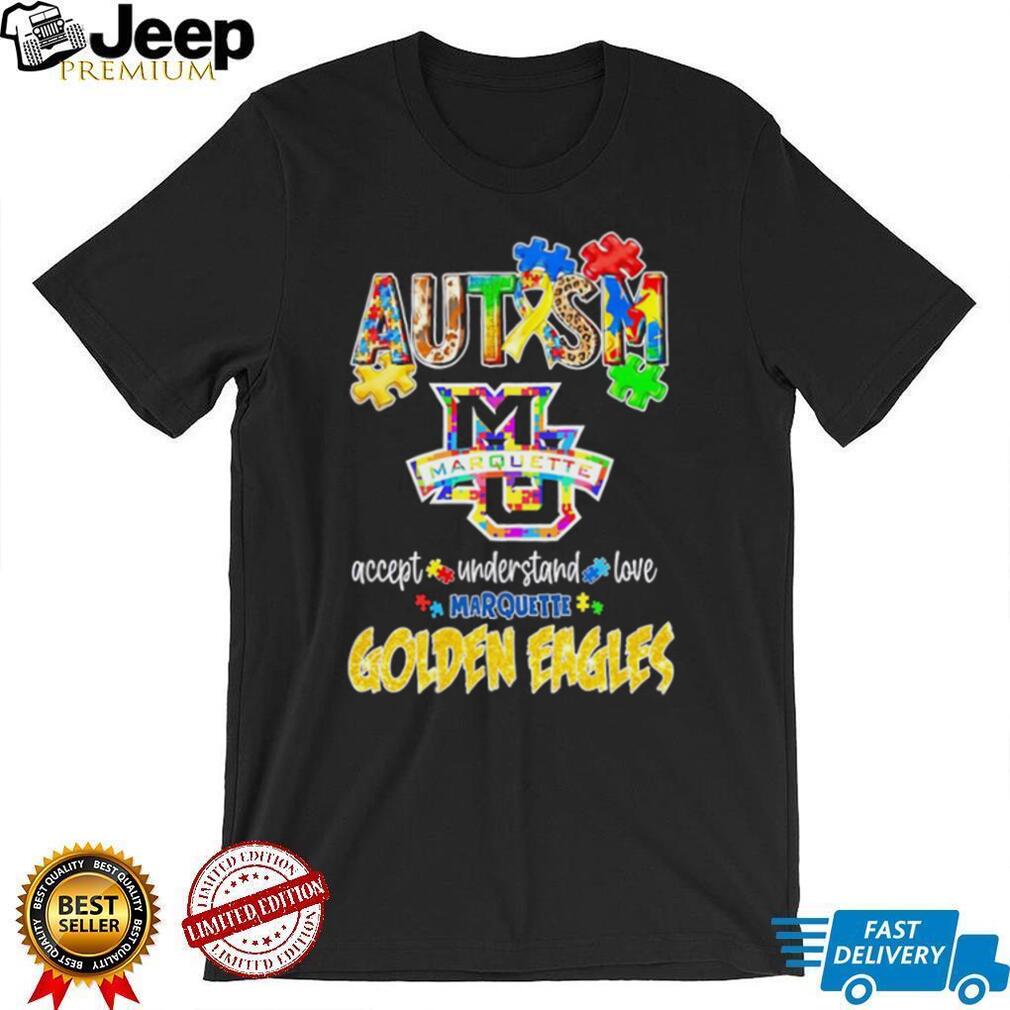 Imagine wearing this shirt at a Marquette Golden Eagles game in the Al McGuire Center, an autism awareness walk, or a casual gathering with fellow fans and advocates, surrounded by individuals who share the same commitment to promoting understanding and acceptance. Now, picture that same person wearing the shirt during everyday activities, using it as a subtle expression of their support for autism awareness and a reminder of the Marquette Golden Eagles’ inclusive spirit. This “Autism Accept Understand Love Marquette Golden Eagles Shirt” allows wearers to showcase their dedication to both a social cause and a beloved team in a recognizable and meaningful way. It’s a statement that blends college sports fandom with a sense of advocacy, allowing for a unique form of self-expression and promoting a shared appreciation for inclusion and compassion within the Marquette community.