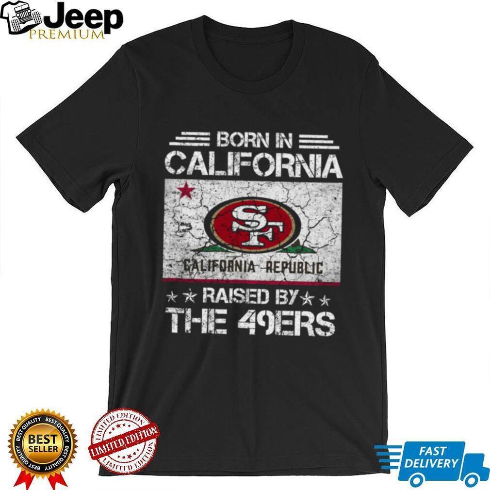 Show your California pride and 49ers devotion with this unique tee! This “Born in California, Raised by the 49ers” T-shirt blends hometown love with football fanaticism. Perfect for those who grew up under the California sun, cheering on their beloved San Francisco 49ers.