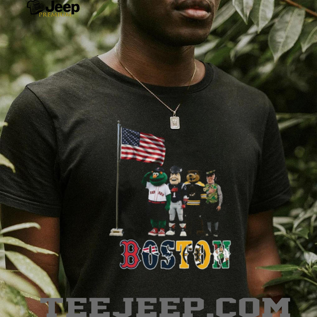 Boston’s iconic sports mascots stand together in a proud American flag salute on this patriotic fan tee. The perfect shirt for Celtics, Red Sox, Patriots, and Bruins fans who love their country.