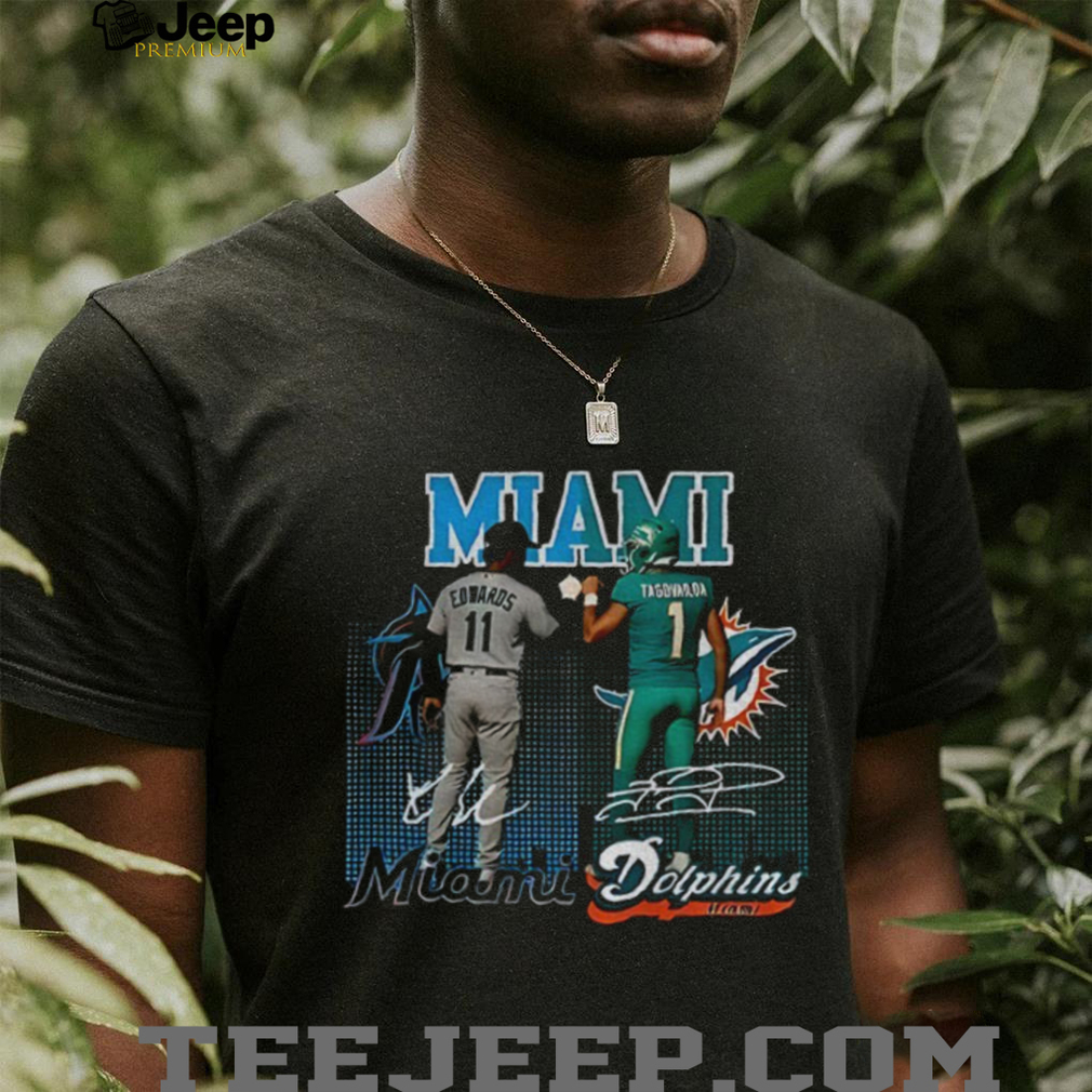 Crafted for comfort and durability, this **Miami Marlins and Miami Dolphins fan shirt** is made from high-quality materials that stand up to game-day excitement and everyday wear. The vibrant print showcases the distinct signatures of both Bryan De La Cruz and Tua Tagovailoa, ensuring they pop with every wear. Whether you’re at the stadium, a tailgate, or just out and about, this shirt will keep you comfortable while you proudly display your dual allegiance. Trust us, it’s the kind of fan gear that separates true enthusiasts from casual observers. Grab yours before they’re all gone – demand is skyrocketing!