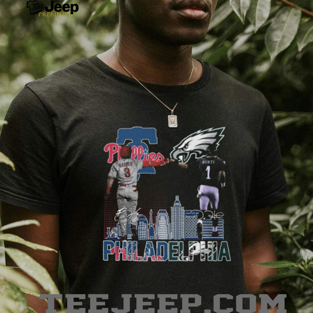 ()Bryce Harper & Jalen Hurts Philadelphia Skyline Fist Bump T Shirt, Treat yourself or make a great gift for your loved ones