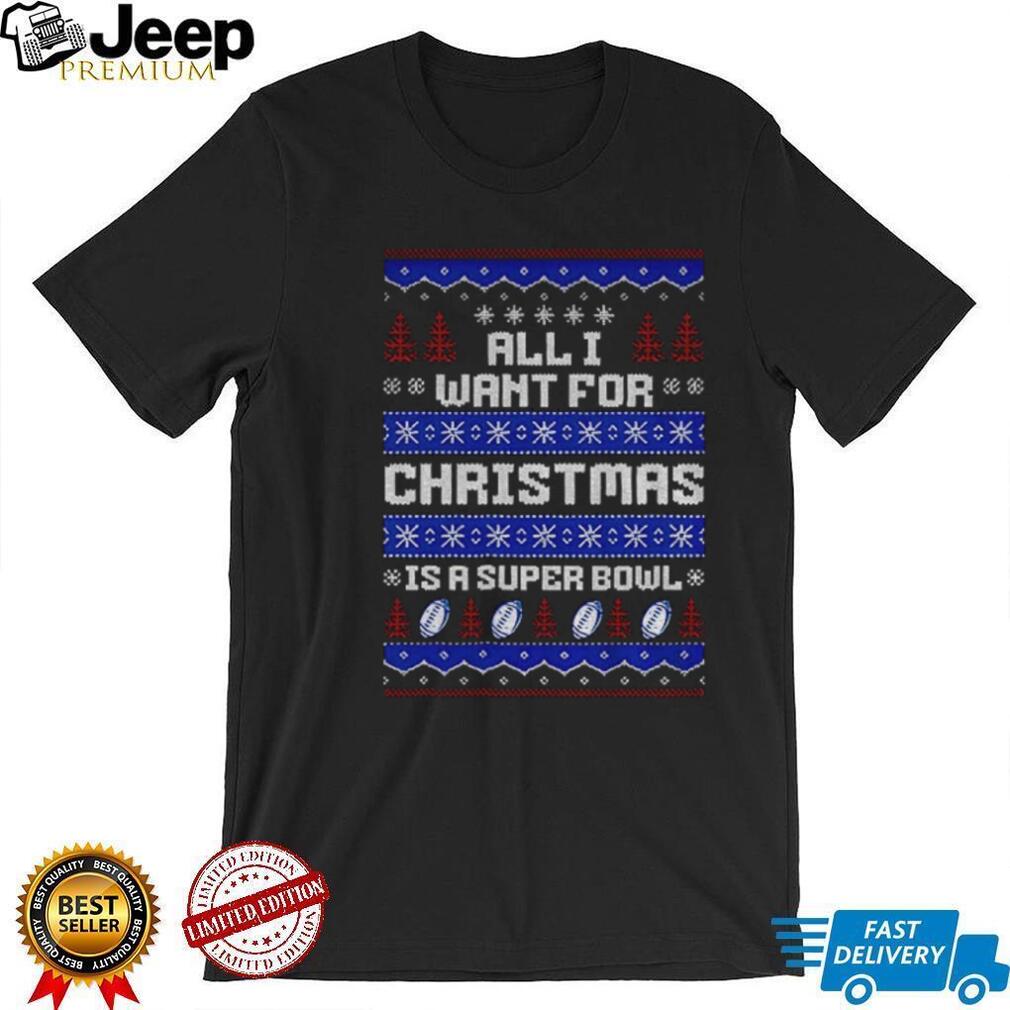This Buffalo Bills Football All I Want for Christmas is a Super Bowl Ugly Christmas 2025 shirt brings a playful and spirited design to your holiday wardrobe. Featuring a festive graphic that blends classic Christmas motifs with Buffalo Bills imagery and the bold “All I Want for Christmas is a Super Bowl” declaration, it’s a true conversation starter. Crafted from a soft, breathable cotton blend, this tee ensures maximum comfort whether you’re at a festive gathering or cheering on your team. Its relaxed fit makes it ideal for fans of all sizes, offering a comfortable and stylish way to show off your Bills spirit during the most wonderful time of the year. This unique Bills holiday shirt solves the dilemma of finding a festive top that truly represents your football passion.