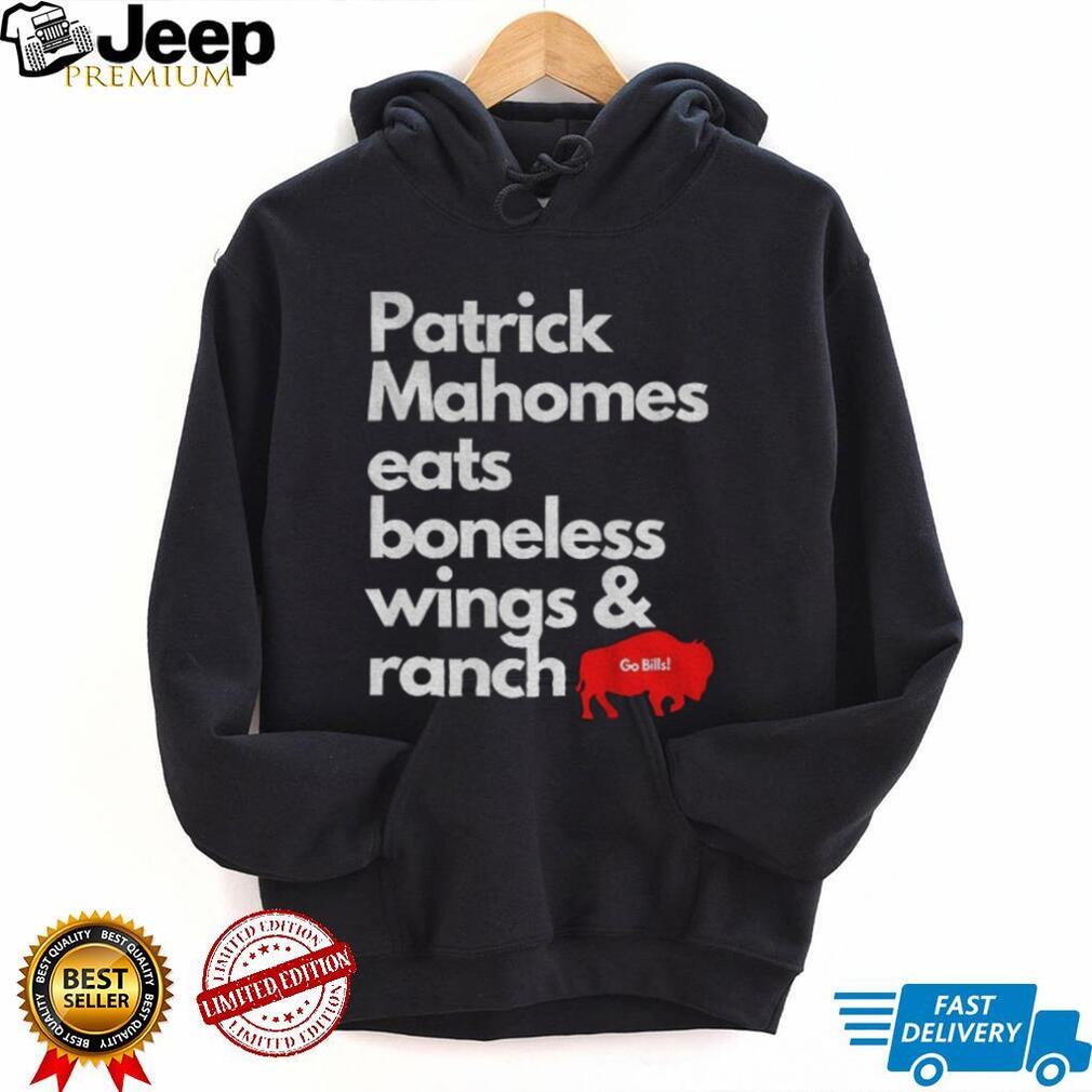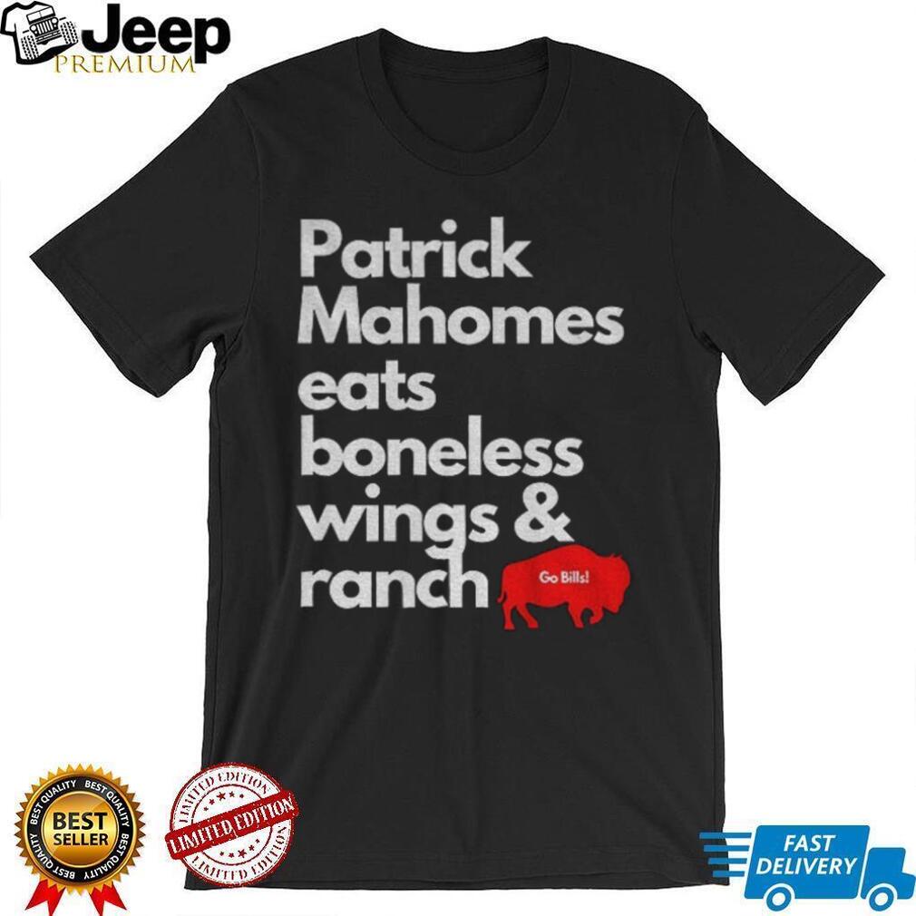 Fuel the rivalry with this hilarious Buffalo Bills shirt! Imagine Patrick Mahomes indulging in the ultimate Bills Mafia faux pas: boneless wings with ranch. This tee is a playful jab at the Chiefs QB, perfect for game day and trash-talking with friends. Are you ready to troll Mahomes with this epic design?