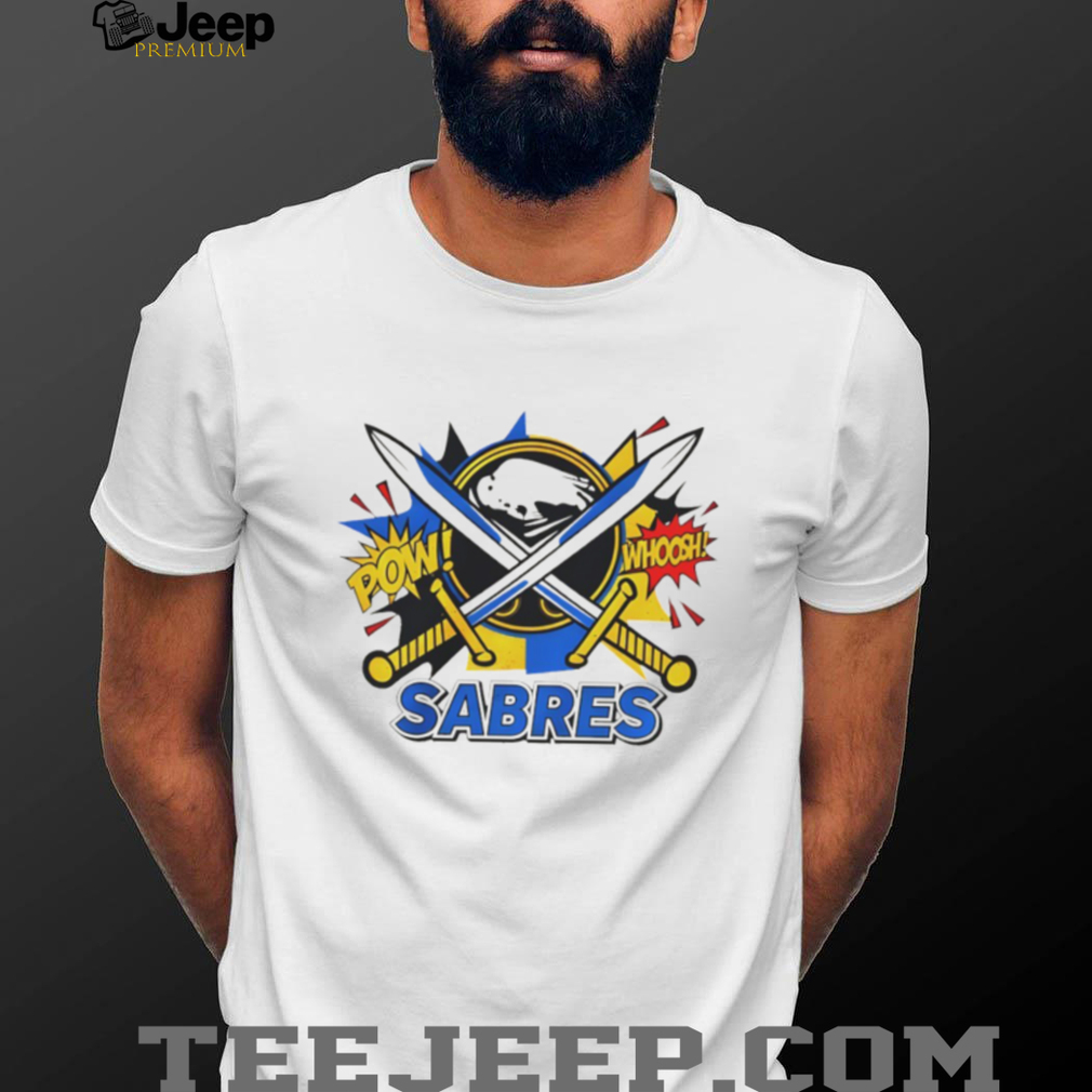 “The technical advancement of “”Buffalo Sabres Comic Book Style Pow Whoosh Hockey T Shirt“” has sparked an intense debate regarding “”technological doping”” in marathon racing. These shoes utilize a stiff carbon fiber plate embedded in ultra-responsive Pebax foam, which acts as a lever to reduce the energy lost in each footstrike. Studies have shown that these shoes can improve running economy by up to 4%, a massive margin in a sport where records are broken by seconds. This has led World Athletics to implement strict regulations on sole thickness and the number of plates allowed to ensure that the “”human element”” remains the primary factor in competition. However, the “”genie is out of the bottle,”” and the sport is now divided into the “”pre-super shoe”” and “”post-super shoe”” eras, with almost every major road world record being shattered by athletes wearing this new generation of footwear technology.
