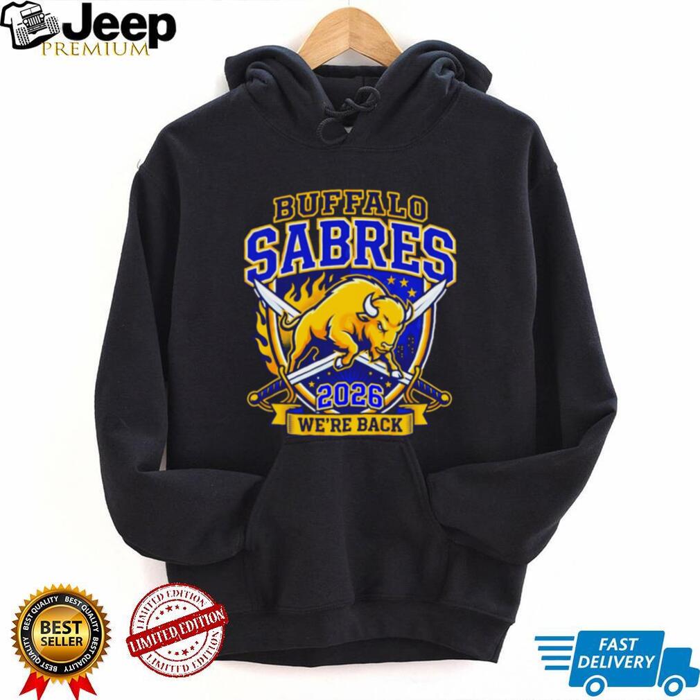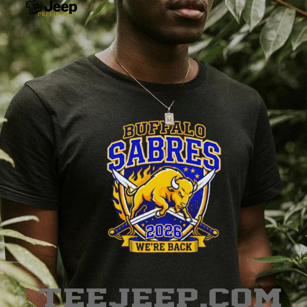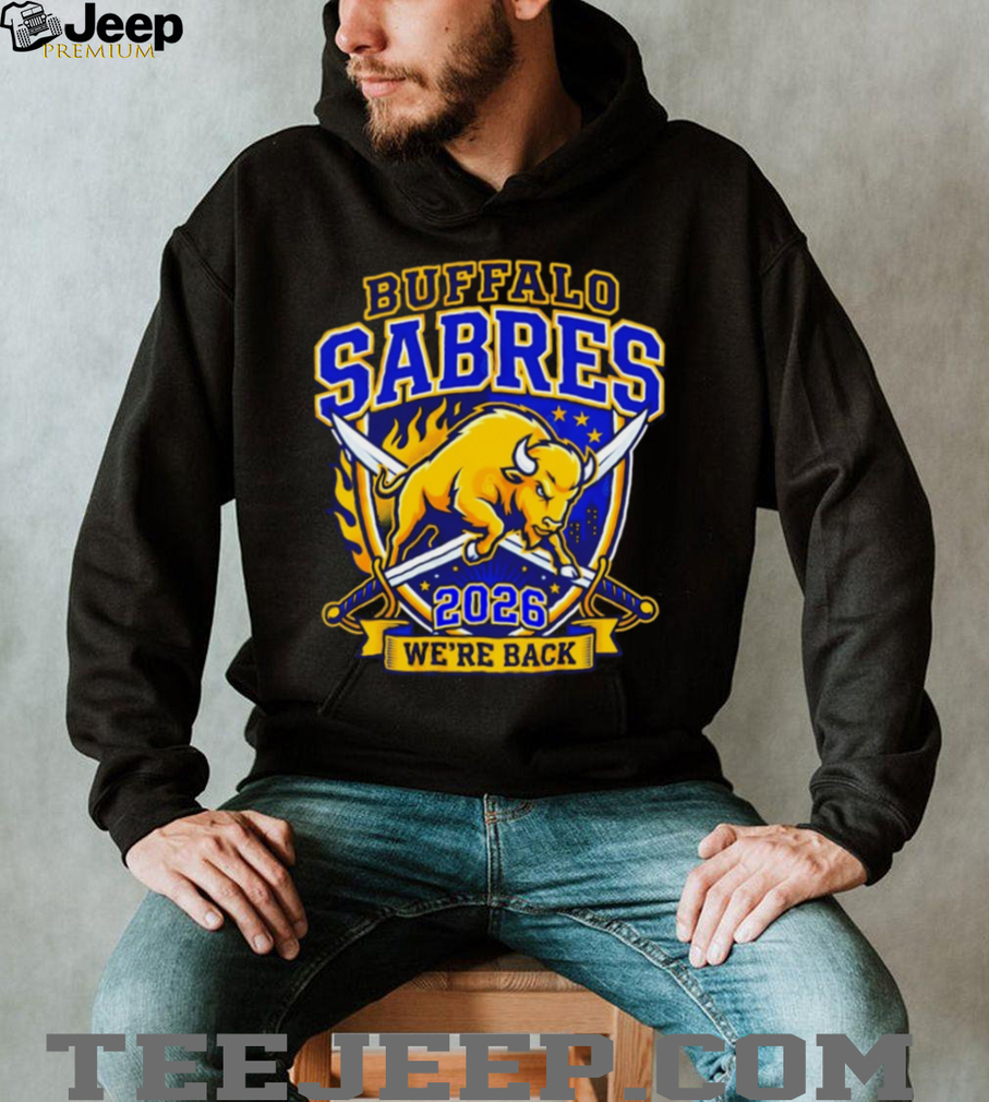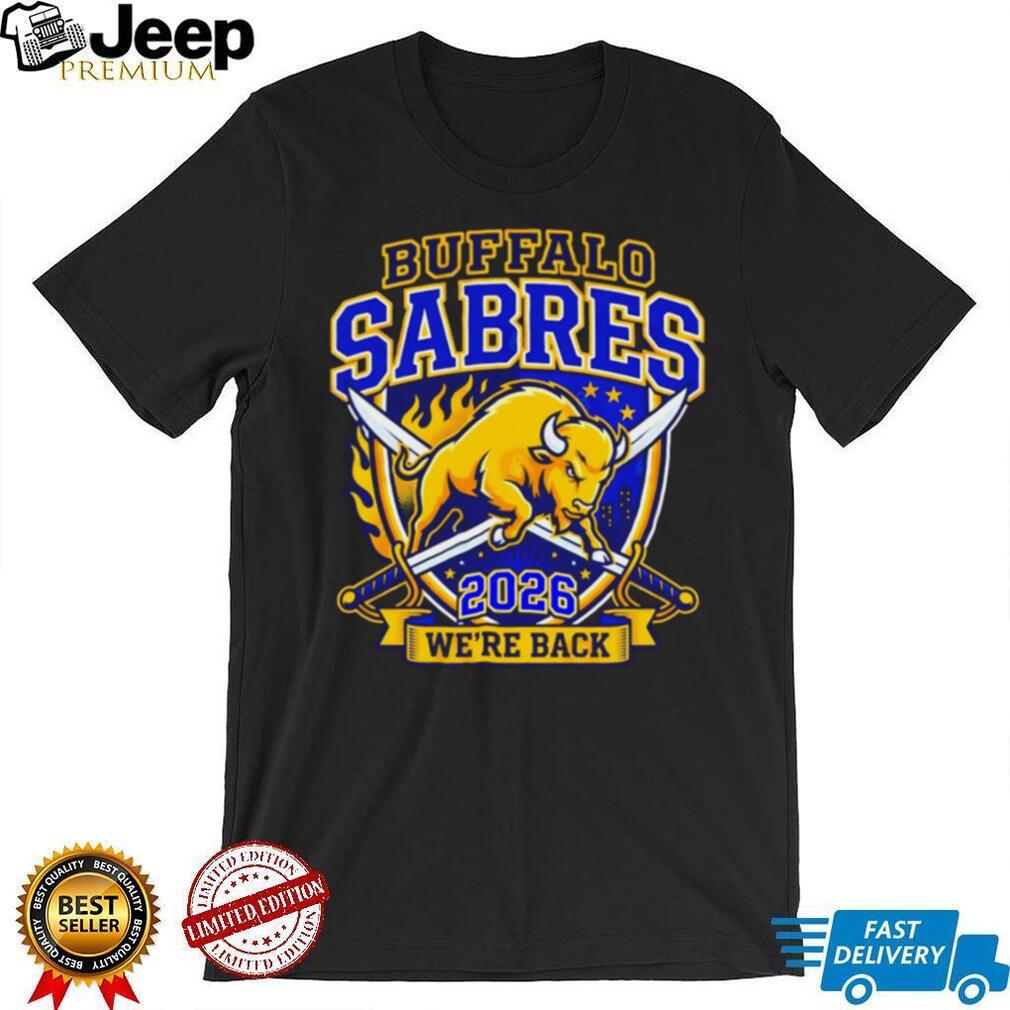 (Buffalo Sabres We’re Back 2026 Charging Buffalo Logo T Shirt)Apr 23