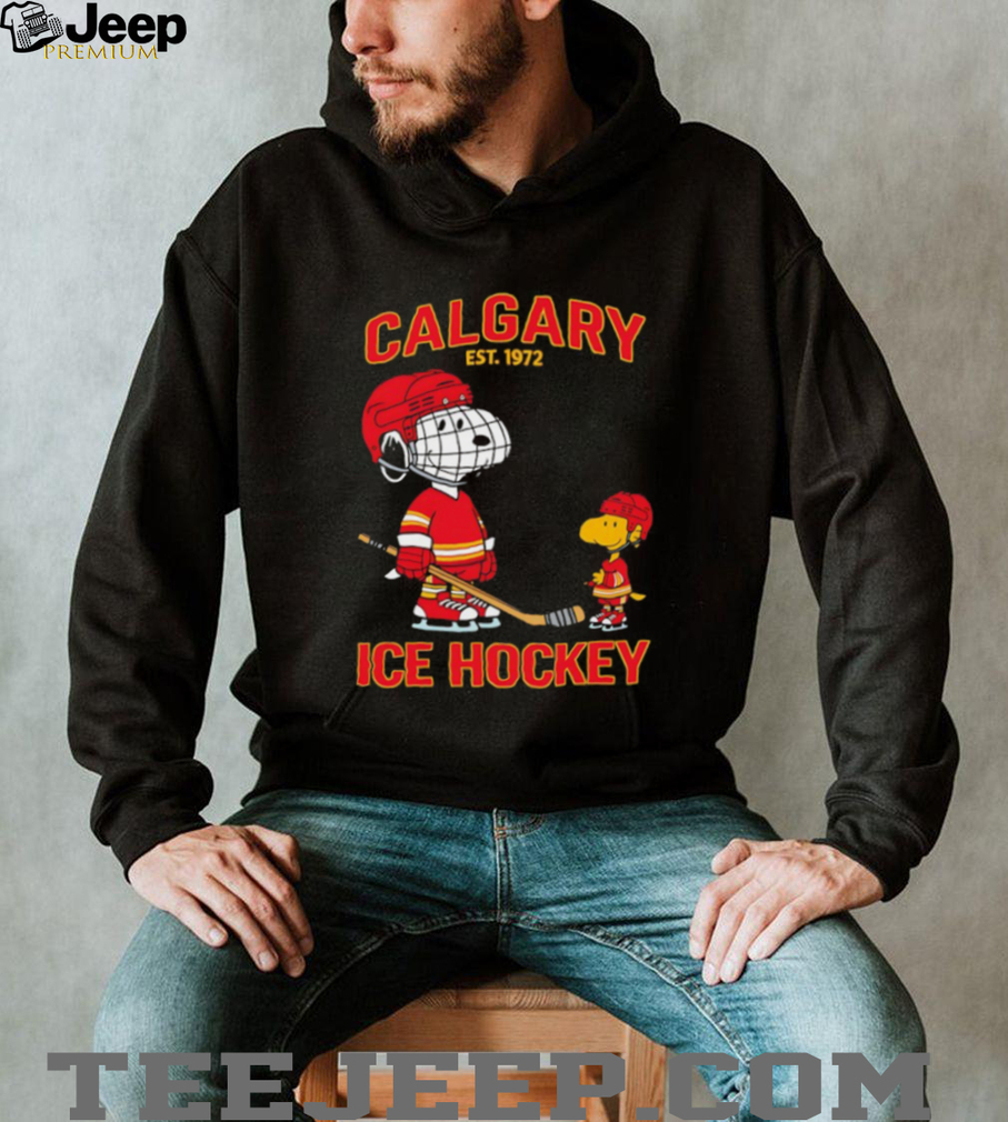 👕 About Calgary Ice Hockey Est 1972 Snoopy and Woodstock Black T shirt