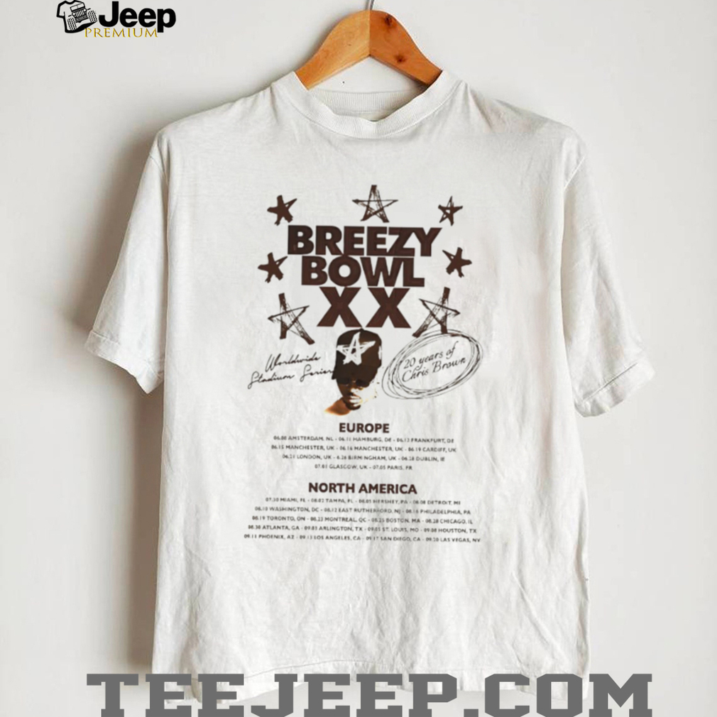 The “Chris Brown Breezy Bowl XX Tour 2 sided 20 years of Chris Brown shirt” is a piece of apparel that commemorates two significant milestones in Chris Brown’s career: the “Breezy Bowl XX Tour” and his 20th year in the music industry. This double-sided shirt serves as both a tour memento and a celebration of his longevity as an artist. It aims to appeal to long-time fans and those attending the specific tour. The design would feature tour related elements and a 20 year anniversary celebration.