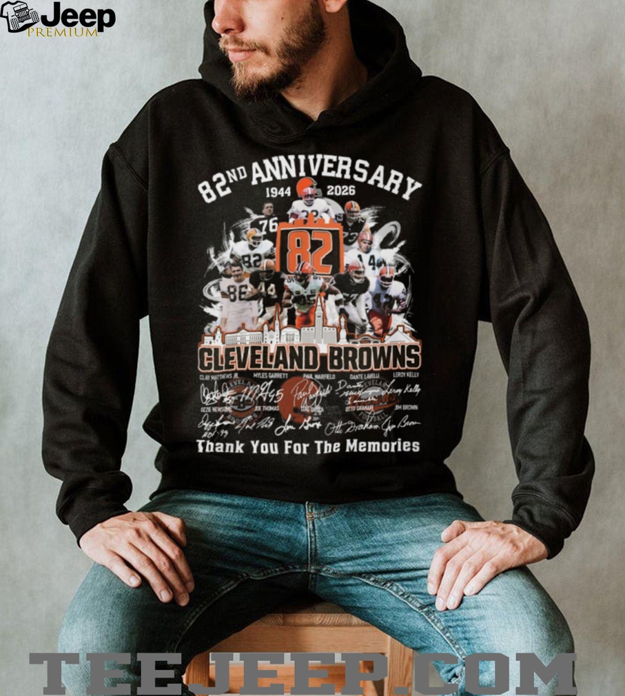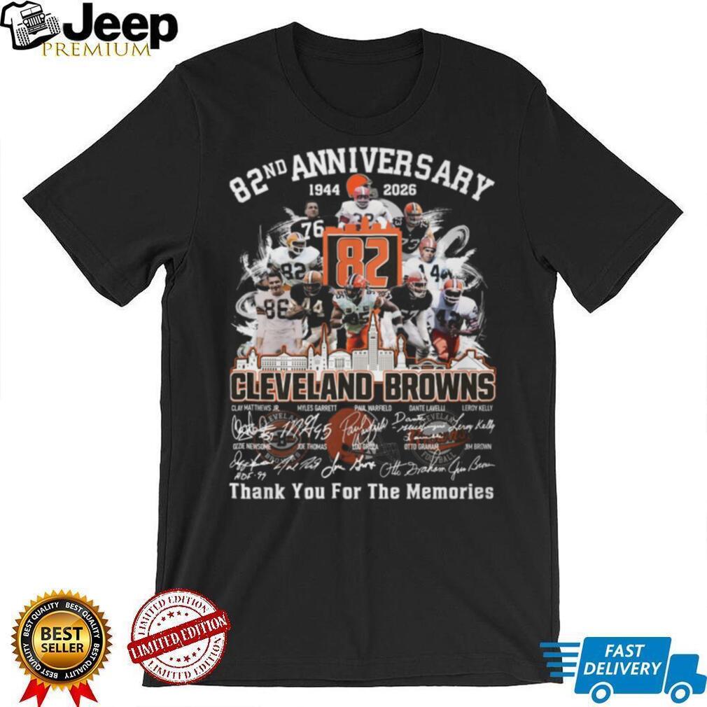 Celebrate 82 years of Cleveland Browns football with this commemorative T-shirt! Featuring a “Thank You For The Memories” design and player signatures, this Cleveland Browns 82nd Anniversary 1944-2026 T-Shirt is perfect for showing your pride and honoring the team’s legacy. A must-have for any die-hard Browns fan!