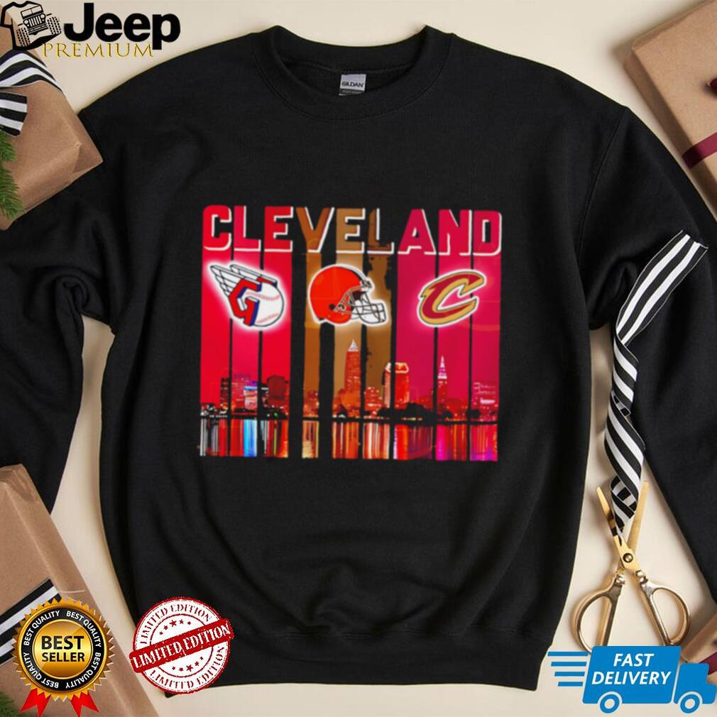 The visual design of this shirt would likely involve a creative arrangement of the Guardians’ “G” wing logo, the Browns’ helmet, and the Cavaliers’ “C” sword logo, perhaps illuminated or stylized to fit the night theme. The city skyline of Cleveland, with its recognizable buildings and landmarks, would serve as the backdrop, possibly silhouetted or subtly detailed. The teams’ primary colors – navy and red for the Guardians, brown and orange for the Browns, and wine and gold for the Cavaliers – might be incorporated in a way that creates visual harmony within the darker night setting. The overall aesthetic aims to be dynamic and visually appealing, capturing the energy and pride associated with Cleveland sports and the city itself after the sun goes down.