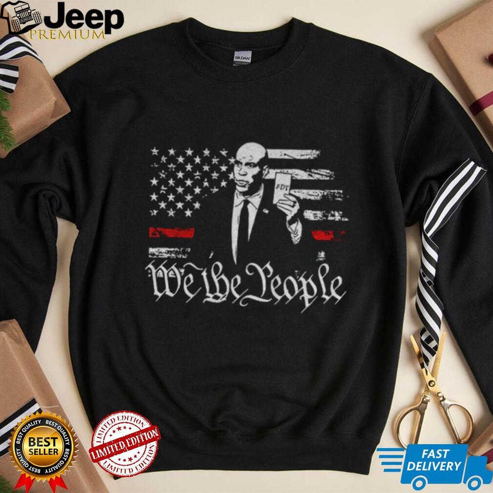 The design of this shirt would likely be visually impactful and politically charged. The phrase “we the people” might be presented in a bold, patriotic font, perhaps superimposed over an image of the American flag. The “FDT” acronym would be a prominent element, potentially stylized or presented in a way that conveys the intended message. Senator Cory Booker’s name or image might be incorporated, either in a supportive or critical context depending on the wearer’s overall message. The color scheme would likely involve a combination of red, white, and blue, potentially with the addition of black to emphasize the dissenting nature of the message. The overall aesthetic aims to be provocative and attention-grabbing, making a clear statement about the wearer’s political views.