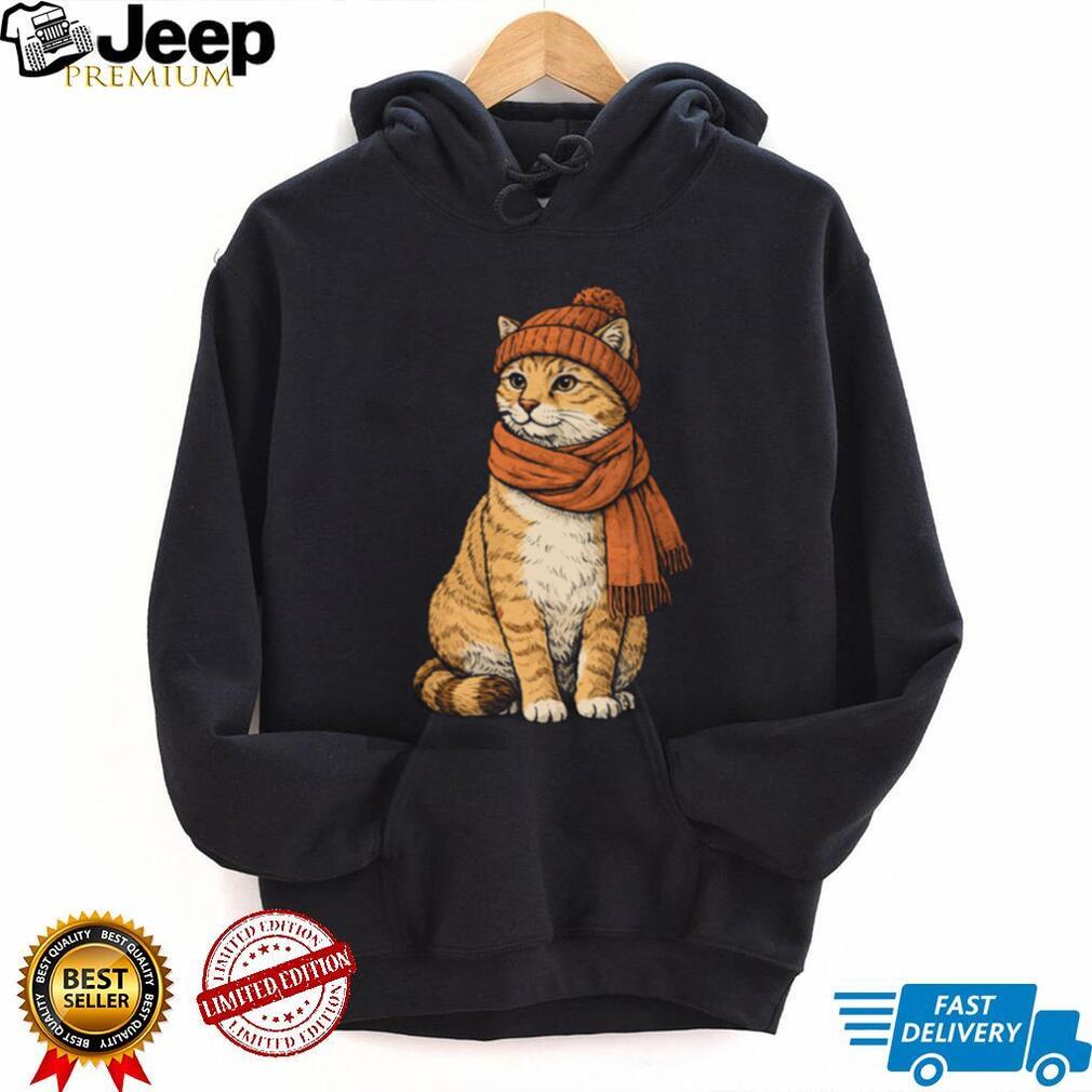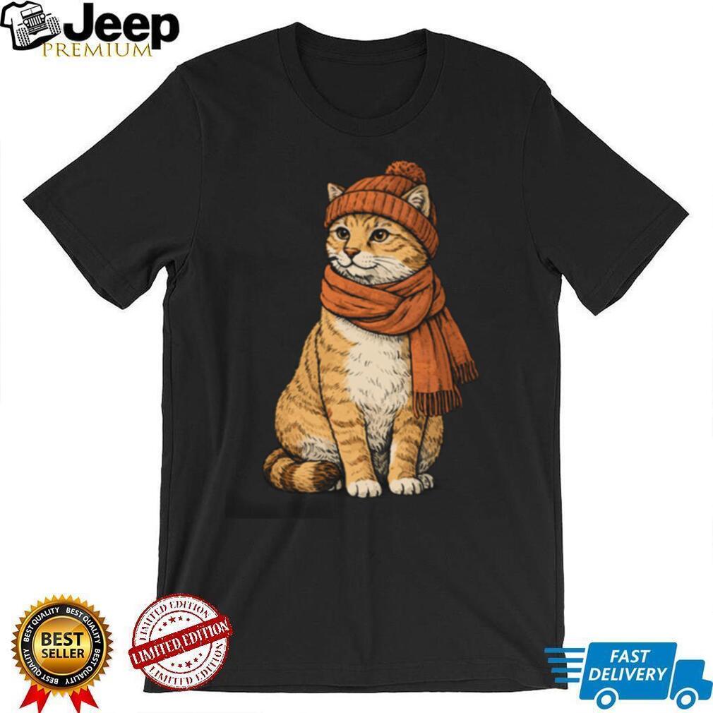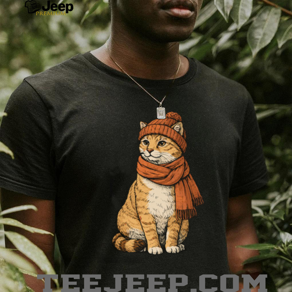 Cozy Autumn Orange Cat with Beanie and Scarf T Shirt, Treat yourself or make a great gift for your loved ones