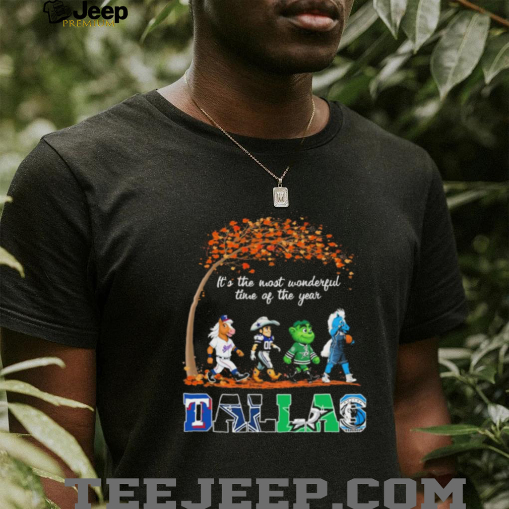 The legendary Abbey Road album cover, where The Beatles famously stride across a zebra crossing, is one of the most recognizable and often parodied images in history. Now, imagine this timeless image re-envisioned with the spirited mascots that define **Dallas’s sports identity**. Picture the iconic **Rowdy** from the Dallas Cowboys, walking alongside the spirited **Mavs Man** from the Dallas Mavericks, the powerful **Rangers Captain** from the Texas Rangers, and the fiery **Victor E. Green** from the Dallas Stars. This ingenious visual pun elevates typical fan gear, offering a unifying and creative representation of Dallas’s rich and often intense sports rivalries. It symbolizes the collective journey and shared passion of fans who stand by their teams through every victory and challenge. The inclusion of “It’s The Most Wonderful Time Of The Year” takes this shirt beyond a simple sports tee, making it a perfect fit for the holiday season or any time you feel that festive game-day cheer. This design doesn’t just show support; it celebrates the unique blend of passion, pop culture, and seasonal joy that defines the modern fan in a city synonymous with winning.