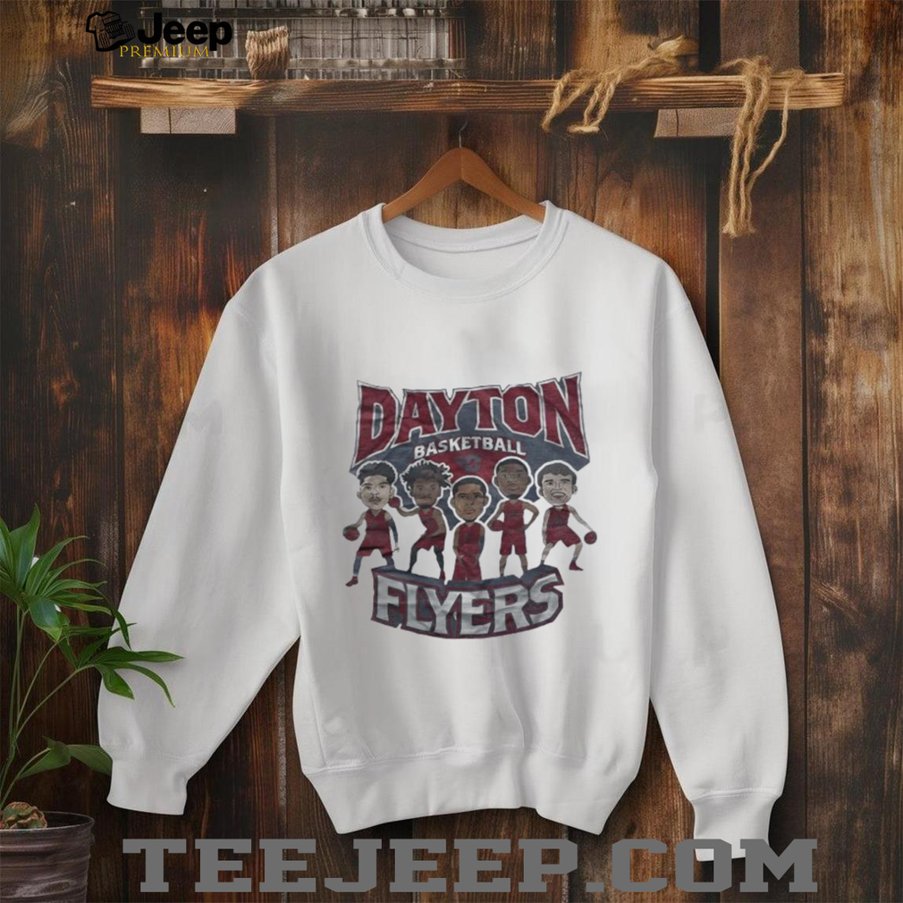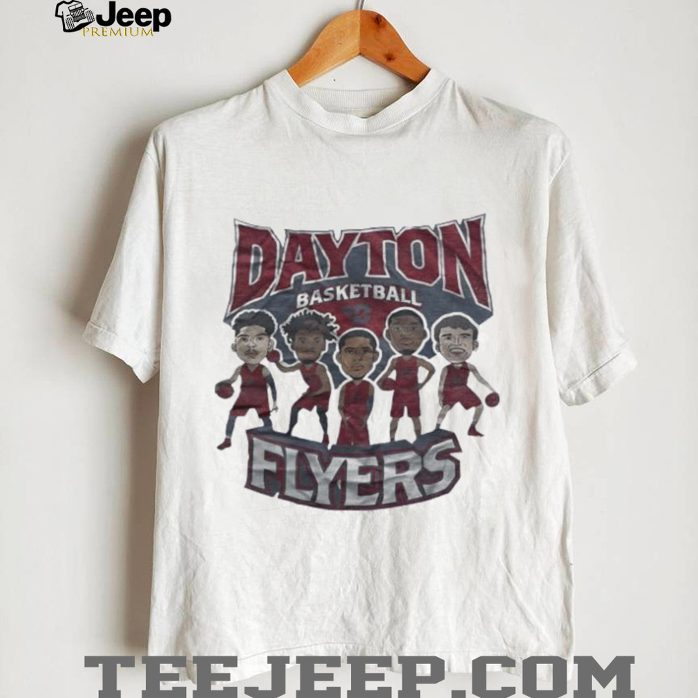 Forget those standard player portraits. This shirt likely features the Dayton Flyers basketball team (or key players) depicted in a fun, exaggerated cartoon style. Think oversized heads, comical poses, maybe even some basketball-related puns thrown in for good measure. It’s a lighthearted and memorable way to show your team pride and let everyone know you don’t take things too seriously (except maybe when it comes to Flyer basketball). Imagine rocking this at the UD Arena – you’ll be an instant conversation starter and a walking, talking embodiment of Flyer fun.