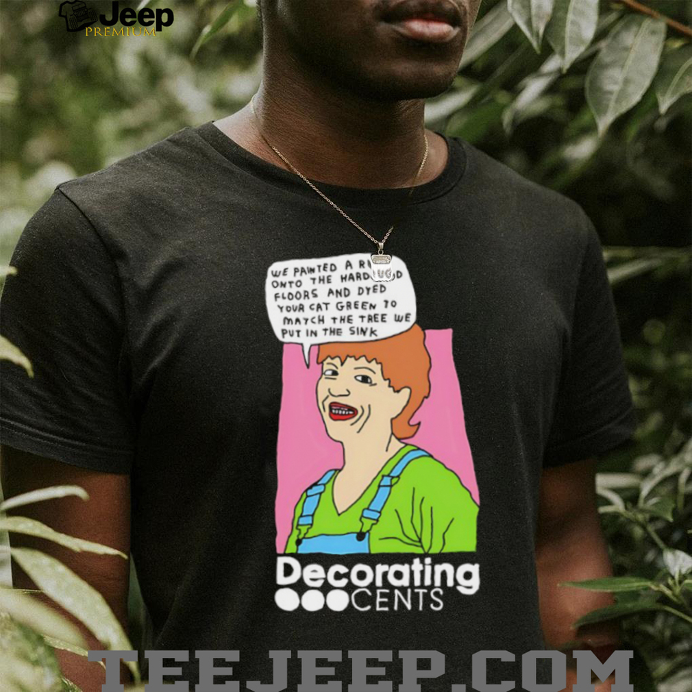 **Decorating Cents**, an HGTV show that originally aired from 1997 to 2007, has recently experienced a massive resurgence in popularity, primarily through viral clips on TikTok and other social media platforms. The show, which challenged designers to transform rooms with a mere $500 budget and limited time, often resulted in “creatively” unique, and at times, truly perplexing, decor. One of the most infamous instances, widely mocked online, involved a designer literally painting a rug pattern directly onto hardwood floors – a decision that left many viewers, and probably the homeowners, scratching their heads. While the show itself never actually featured anyone dyeing a cat green (and we sincerely hope it never did, as pet dyeing is a controversial and potentially harmful practice for animals, often deemed unethical by animal welfare organizations, with some states even making it illegal), the inclusion of this outlandish act in the shirt’s phrase perfectly captures the spirit of extreme, no-holds-barred “budget” decorating that **Decorating Cents** has become synonymous with in viral culture. It’s an exaggerated, humorous extension of the show’s “anything goes” approach to home improvement. If you like to zoom in this way, you can also refer to some popular designs that feature other pop culture references to humorous or absurd moments in television and film.
