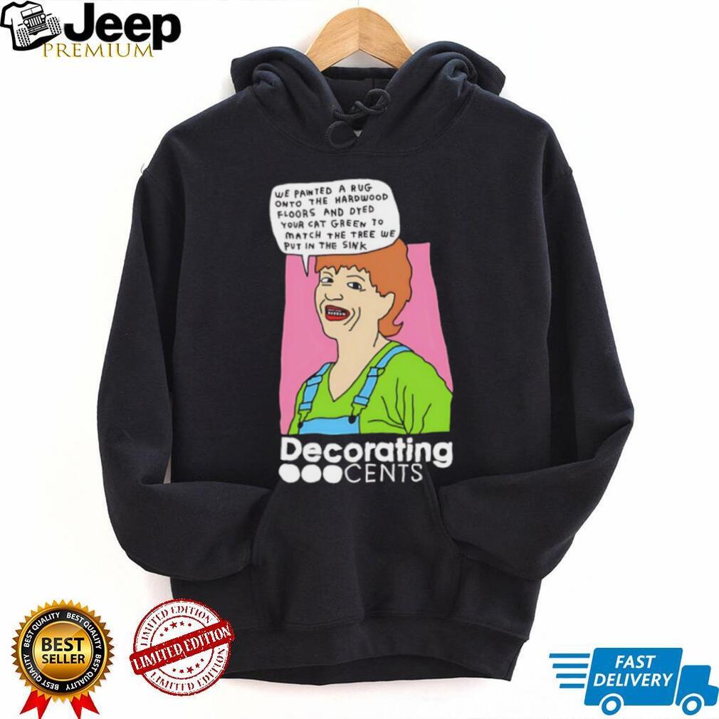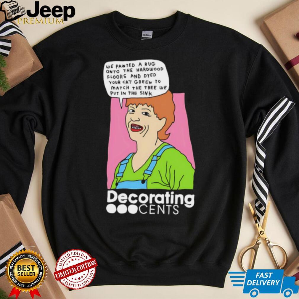This “Decorating Cents We Painted a Rug onto the Hardwood Floors and Dyed Your Cat Green shirt” is ideal for anyone with a sharp sense of humor, a love for internet culture, and a nostalgic appreciation for the quirky side of early 2000s television. It’s for those who find joy in the delightfully bad, who can laugh at themselves, and who aren’t afraid to make a bold, offbeat statement with their apparel.