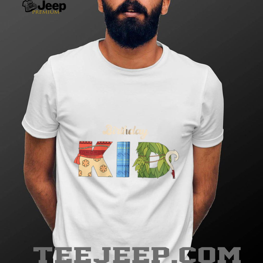 The shirt showcases bold, multicolored letters spelling out “Birthday Kid” with a Moana-inspired tropical theme. The design incorporates island motifs such as flowers and waves, reflecting Moana’s connection to the ocean and Polynesian culture. This playful and eye-catching graphic makes the birthday child stand out as the star of the party, adding a magical touch to any celebration.