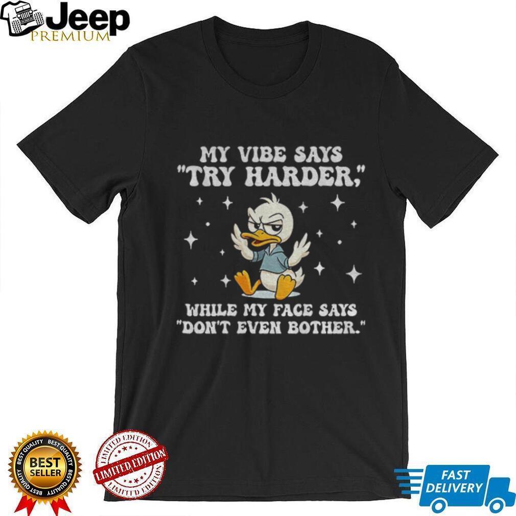 Let your shirt do the talking with this hilarious “Duck my vibe says try harder while my face says don’t even bother” T-shirt. This funny and sarcastic tee is perfect for those days when you just can’t be bothered. It’s a statement piece that speaks volumes without you having to say a word!