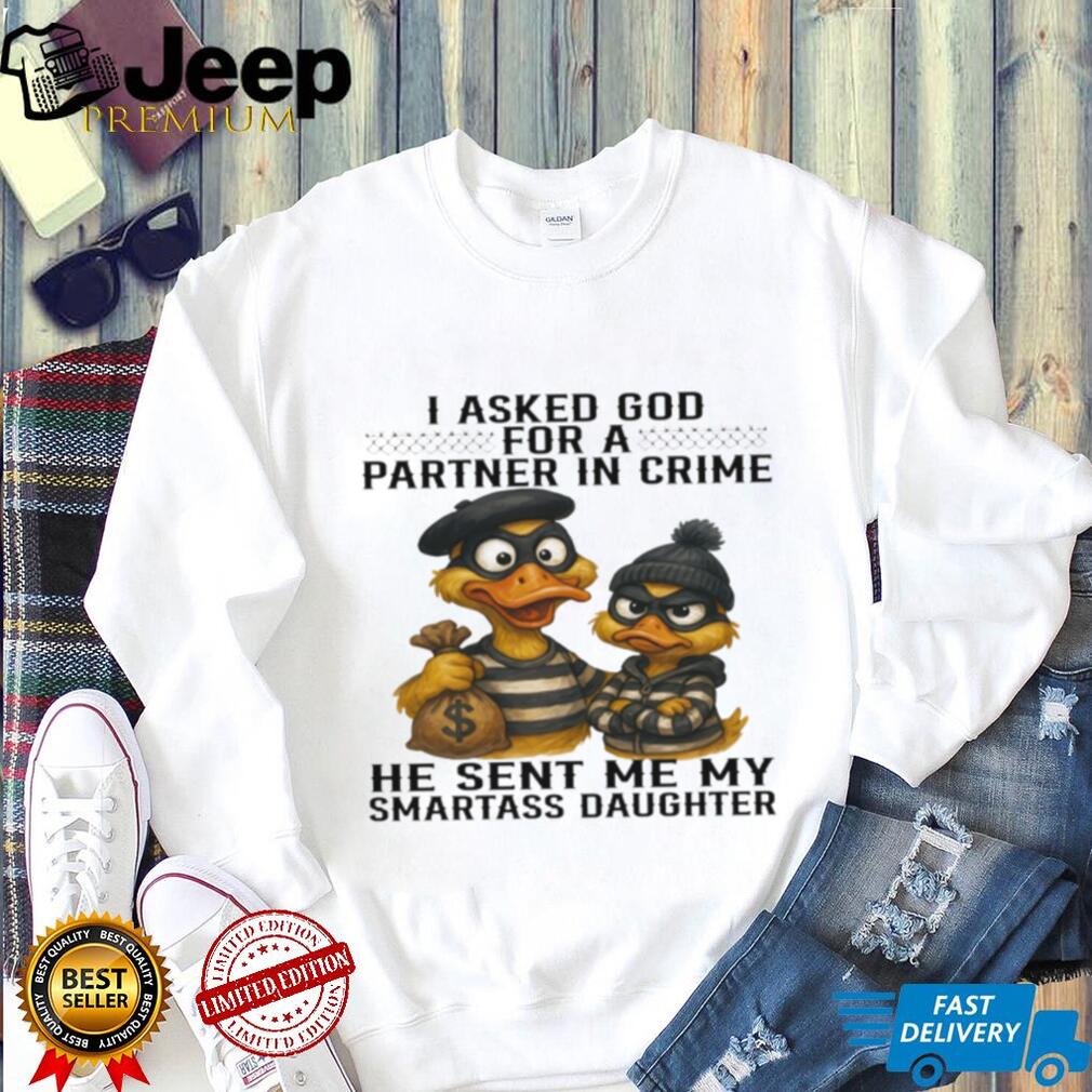 The “Ducks I asked God for a partner in crime shirt” is a piece of apparel that combines a religious reference with a humorous twist, using ducks as the focal point. This shirt aims to express a lighthearted sense of camaraderie and mischief, suggesting a playful partnership with a divine blessing. The use of ducks adds an element of whimsicality and absurdity. The design prominently features ducks and the quoted phrase.
