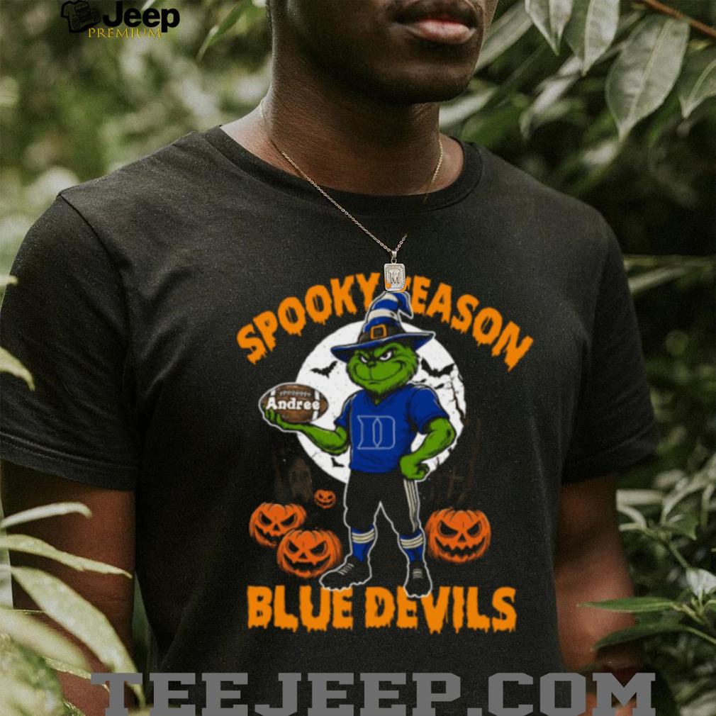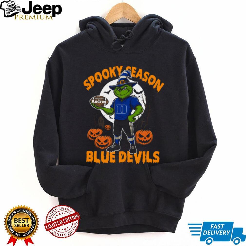 Get ready for spooky season with this awesome Duke Blue Devils Spooky Season Shirt! Combining your love for Duke football with a Halloween twist, this NCAA Football Grinch Tee is perfect for showing off your team spirit with a touch of holiday fun. Customize it with a name for a truly unique Halloween College Fan Outfit.