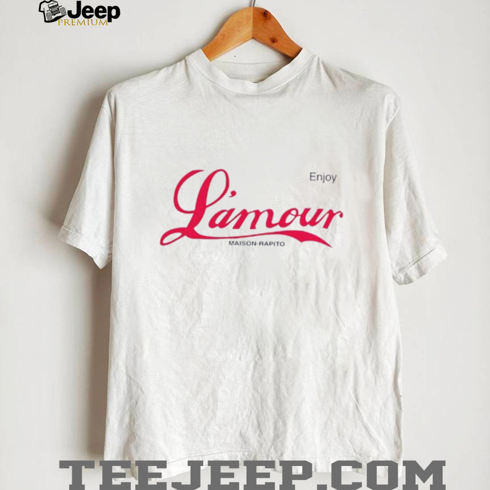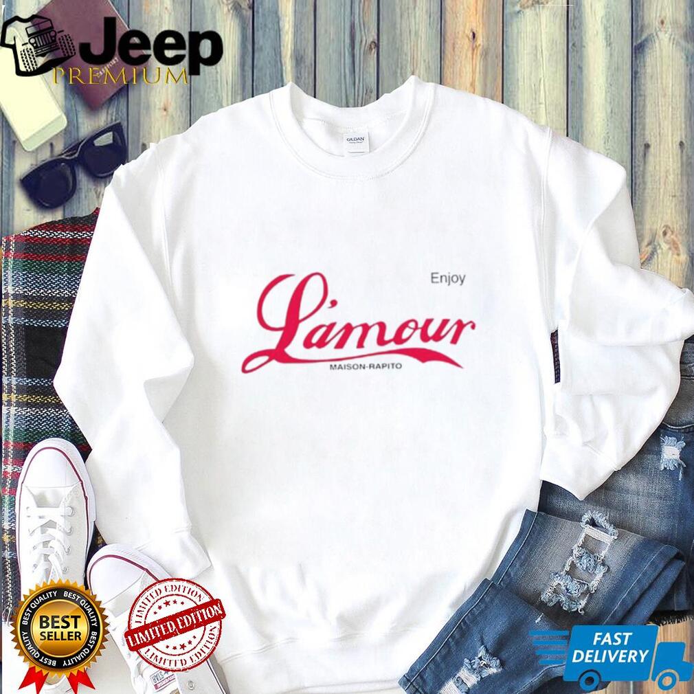 The phrase “Enjoy L’amour Maison Rapito shirt” presents a combination of French and possibly Italian words, creating a somewhat ambiguous message. “L’amour Maison” translates to “The Love House” in French, while “Rapito” can mean “kidnapped” or “enraptured” in Italian. This juxtaposition of romantic imagery with a word suggesting capture creates a sense of intriguing contradiction. The shirt’s message likely aims to evoke a sense of mystery or perhaps a playful, edgy take on romance.