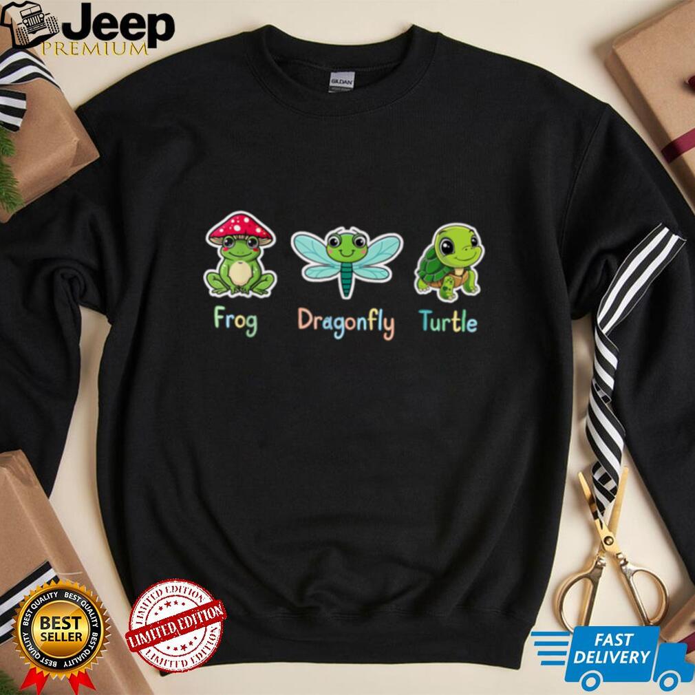 Wearing this t-shirt allows individuals to express their affinity for the natural world and these particular creatures. Frogs, with their vibrant colors and amphibious lifestyle, dragonflies with their intricate wings and aerial agility, and turtles with their ancient wisdom and patient nature, each hold a unique charm. By showcasing these three together, the shirt might symbolize balance, transformation (like a tadpole to a frog or a nymph to a dragonfly), or simply a love for the diverse fauna found in watery habitats. It’s a way to carry a piece of the natural world with you and share your appreciation for these fascinating animals.