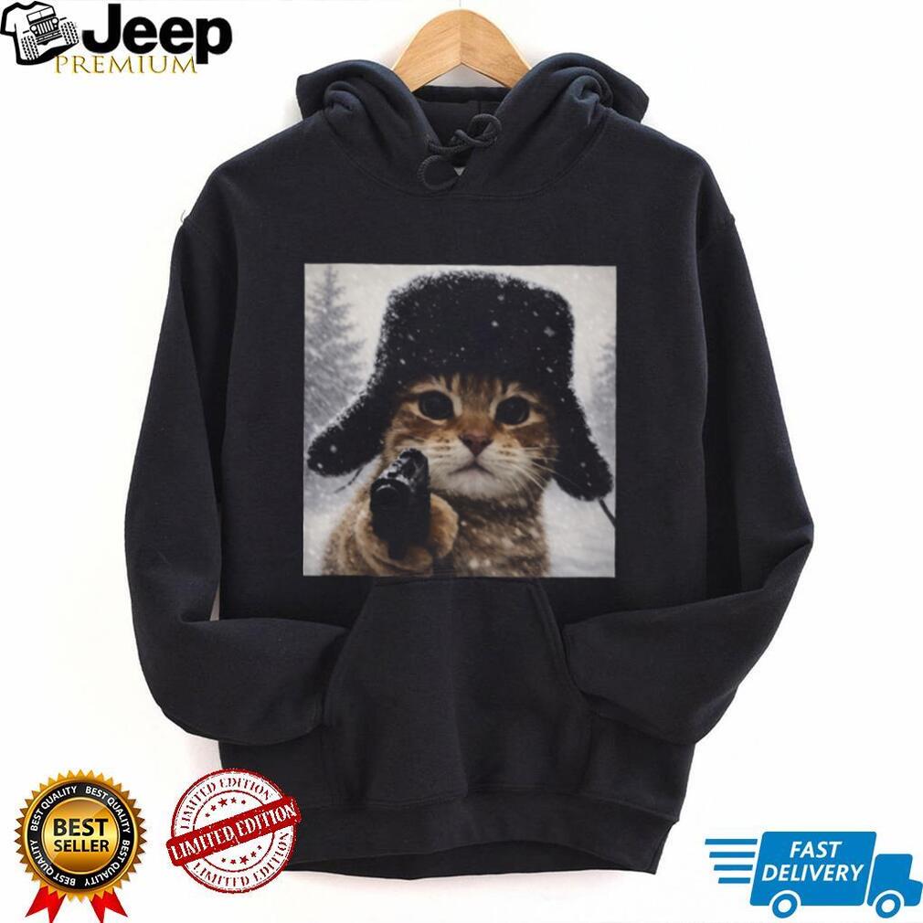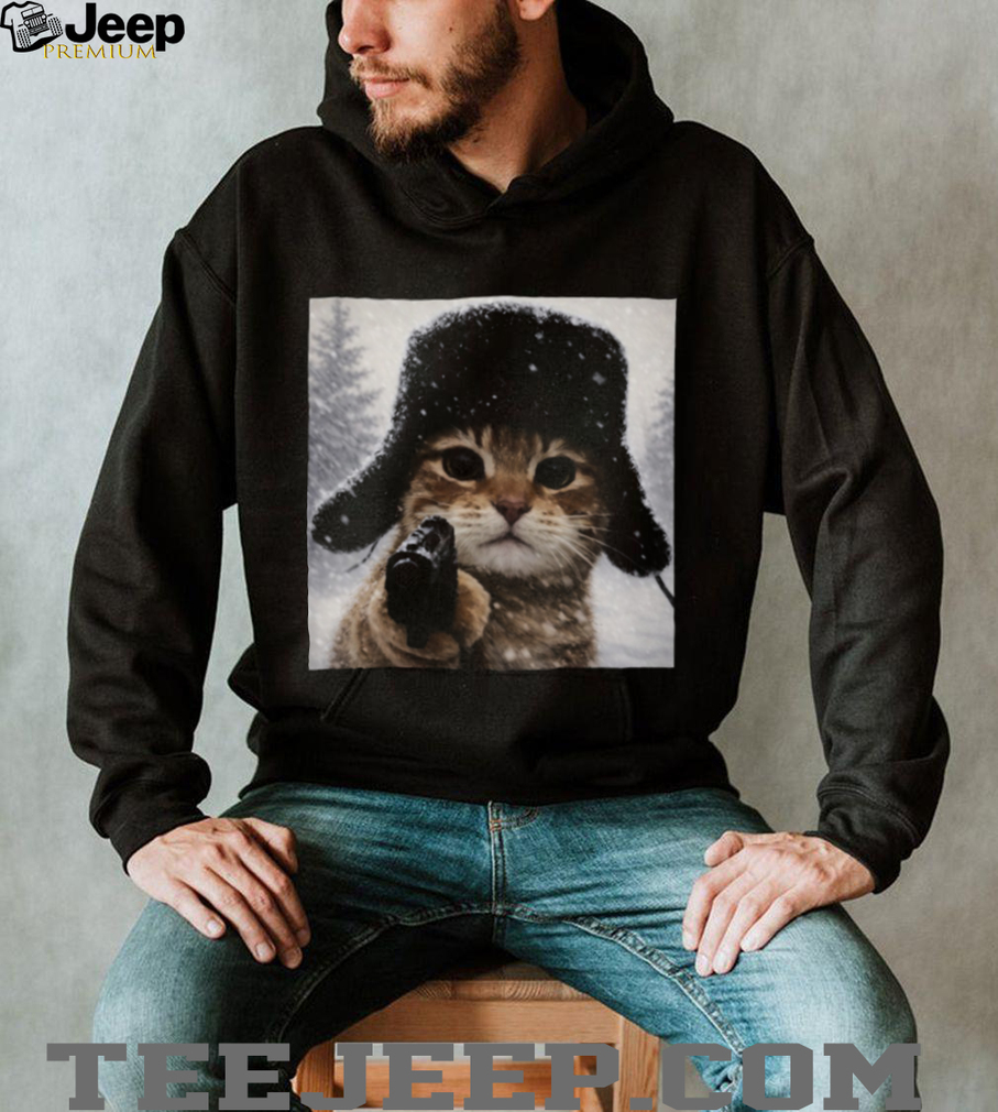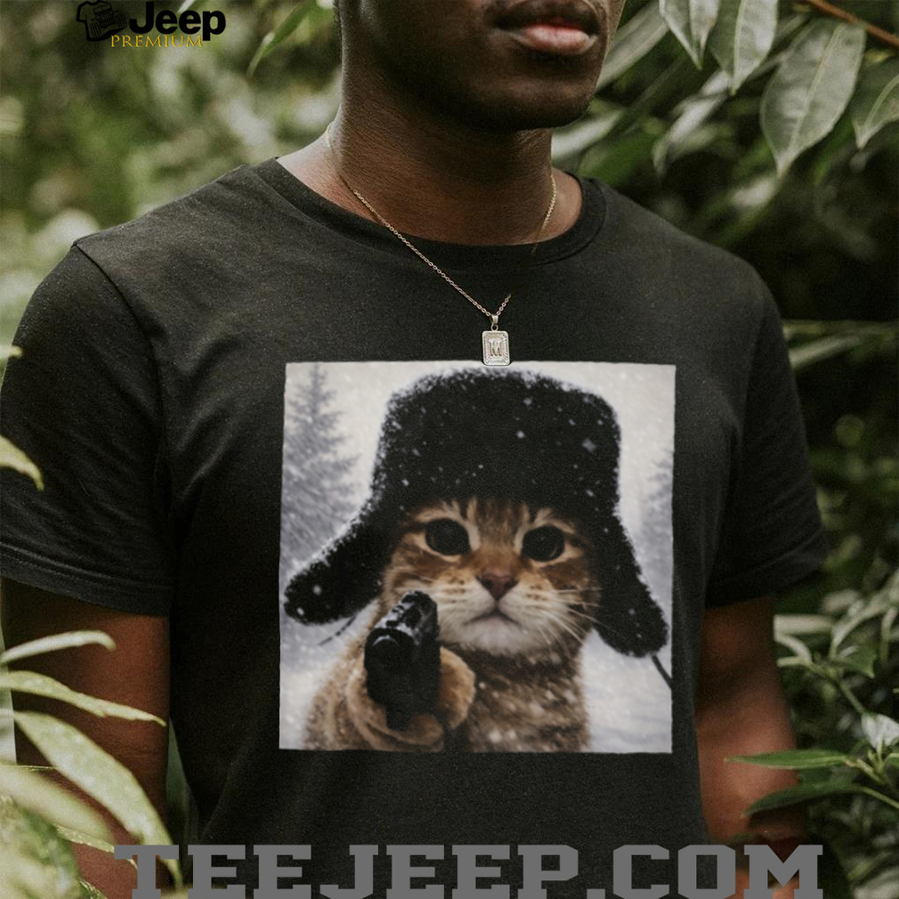 (Funny Gangster Cat with Gun in Snow Russian Hat Graphic T Shirt)Funny Gangster Cat with Gun in Snow Russian Hat Graphic T Shirt, Treat yourself or make a great gift for your loved ones
