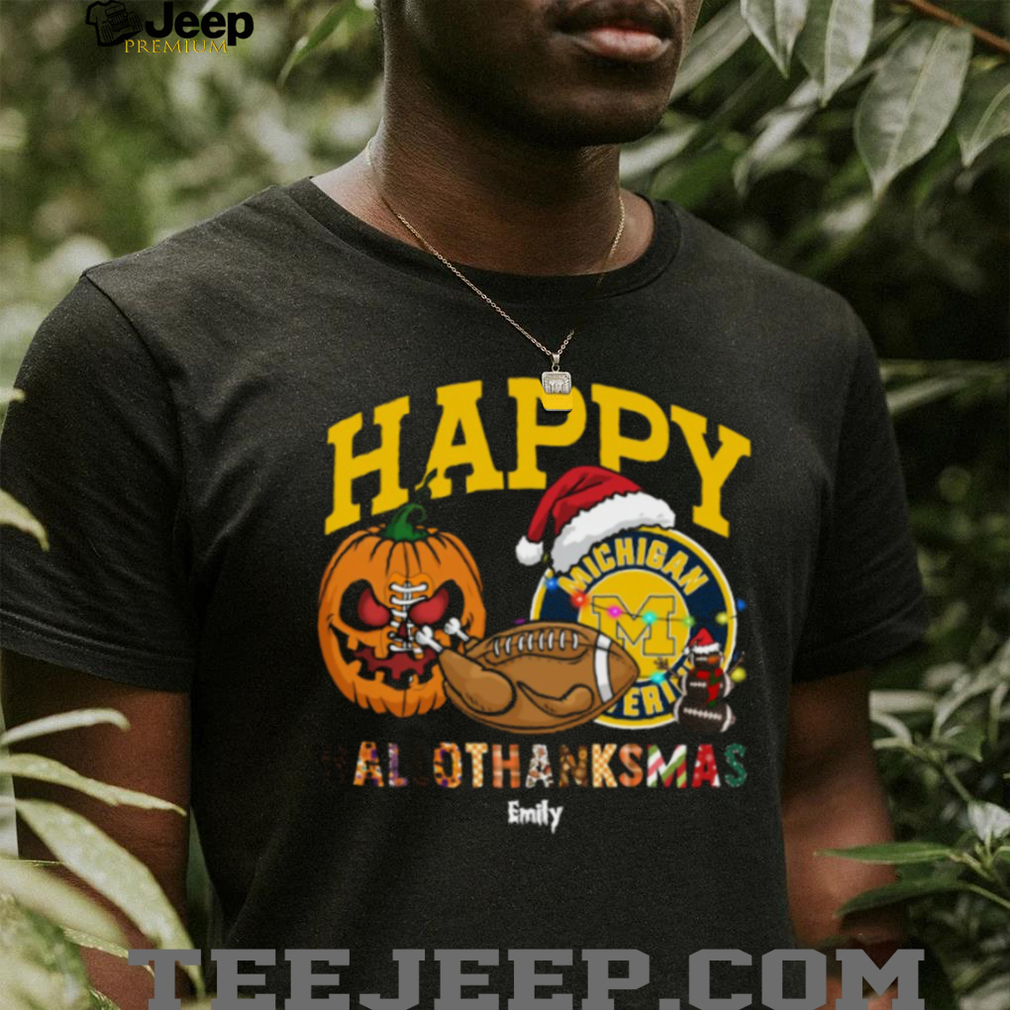 Show your Michigan Wolverines pride this holiday season with this Funny HalloThanksMas Shirt! This personalized holiday tee combines the fun of Halloween, Thanksgiving, and Christmas into one spirited design. Featuring a pumpkin football and Santa hat, it’s the perfect NCAA fan gift for any Wolverines supporter.