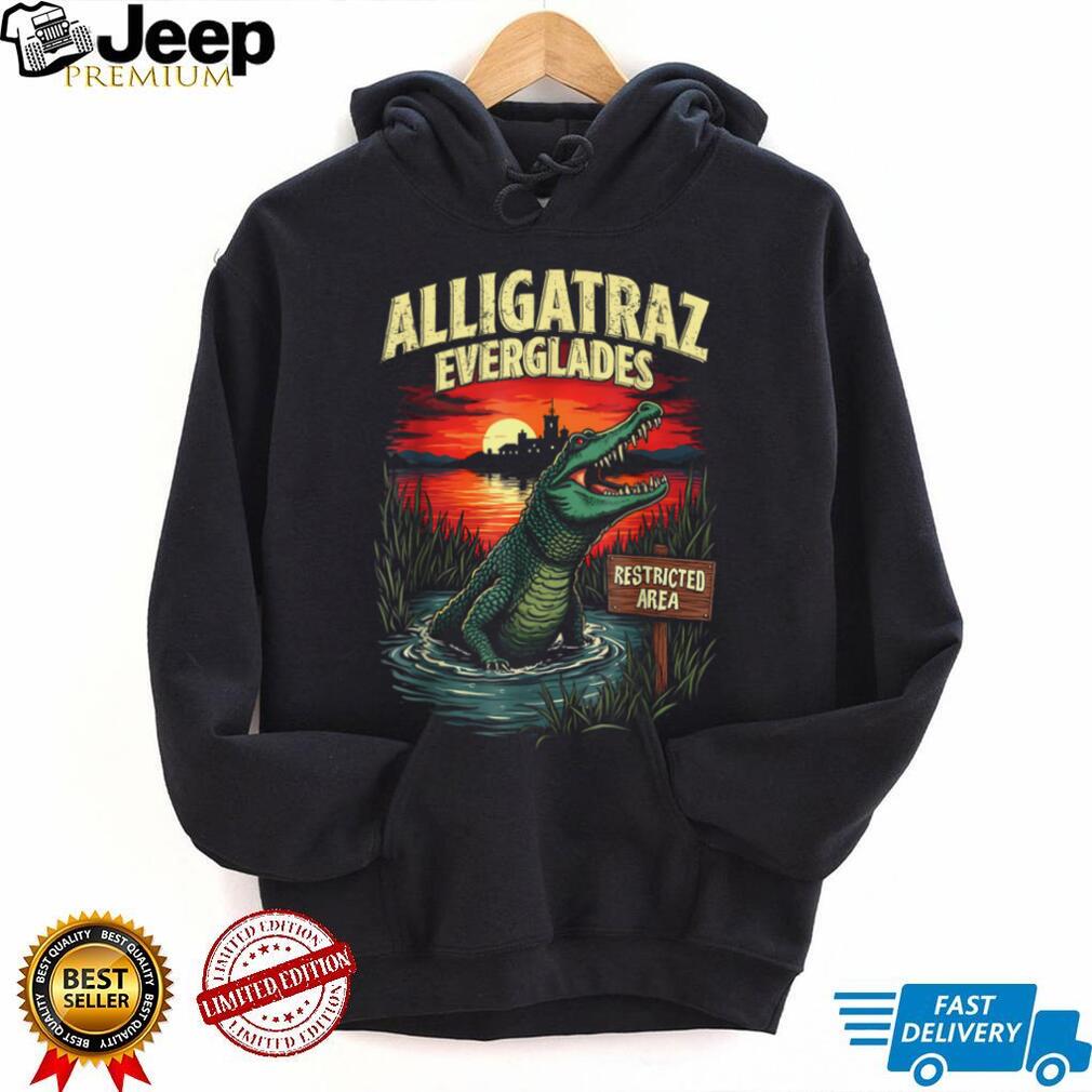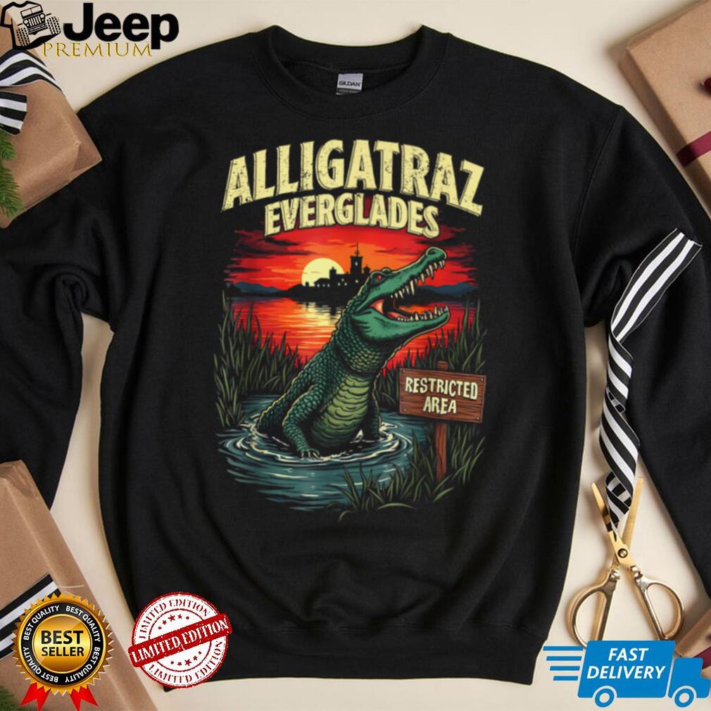 **Alcatraz**, the infamous former federal prison located on an island in San Francisco Bay, is a closed entity synonymous with “inescapable.” Its history is filled with tales of attempted breakouts, most famously the 1962 escape by Frank Morris and the Anglin brothers, whose fate remains unknown. The legend of **Alcatraz’s** impregnable nature serves as the perfect counterpart to the natural “prison” of the **Everglades**. By combining these two concepts, the shirt creates a humorous comparison, asserting that the Everglades, with its resident alligators, could be just as, if not more, effective at containment. This blend of well-known historical severity with a humorous natural twist provides a strong element of social proof for those who appreciate witty and culturally informed jokes.