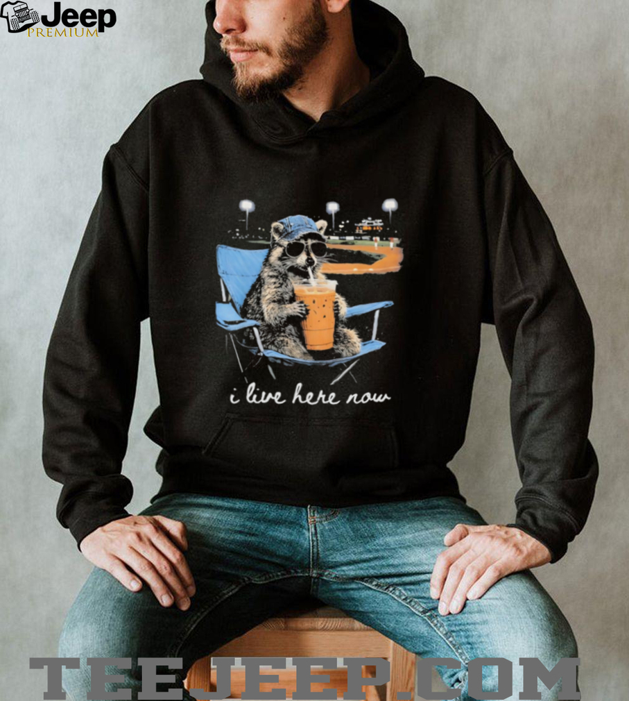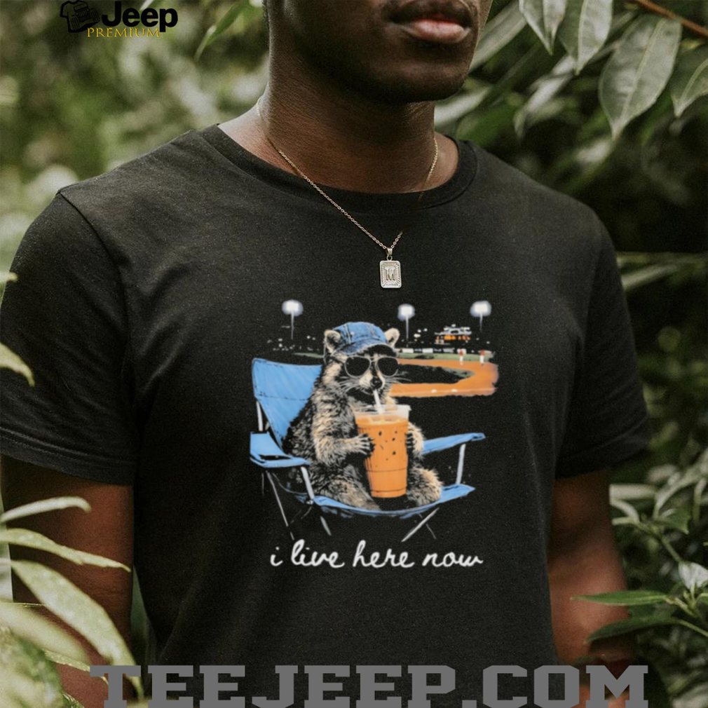 (Funny Raccoon at Baseball Field “I Live Here Now” Drinking Iced Coffee T Shirt)Apr 19