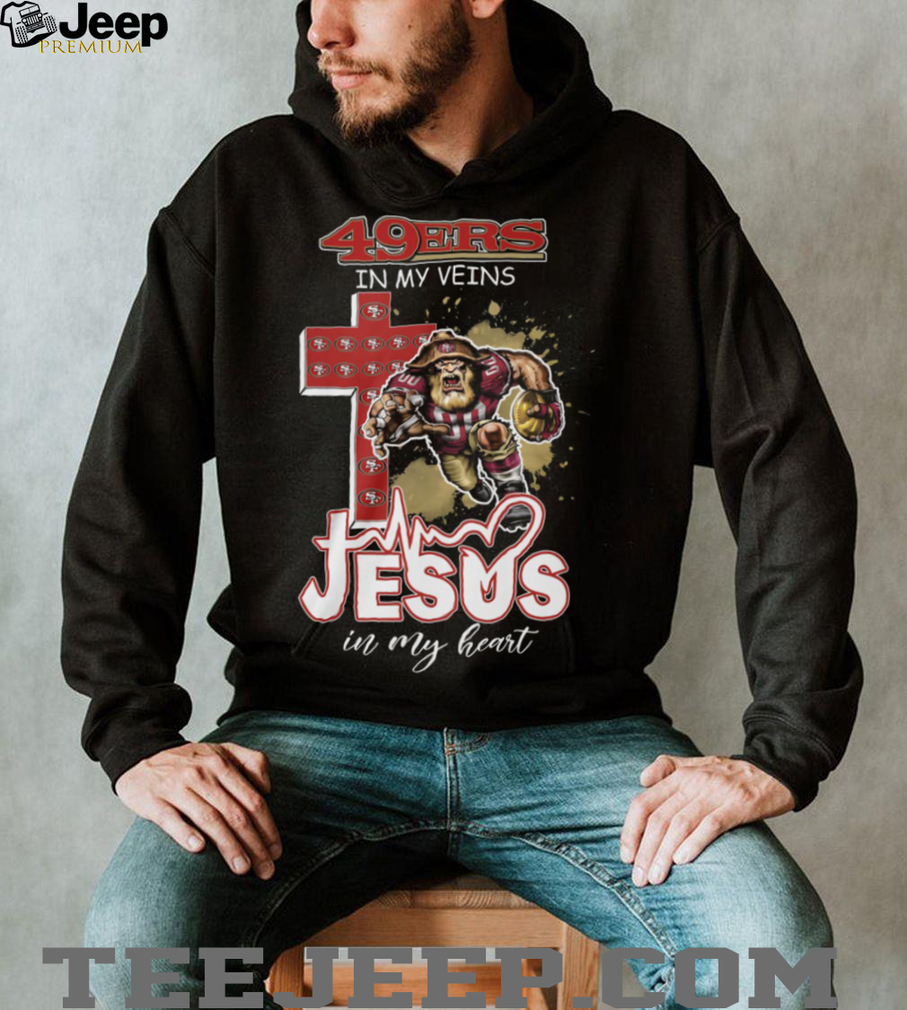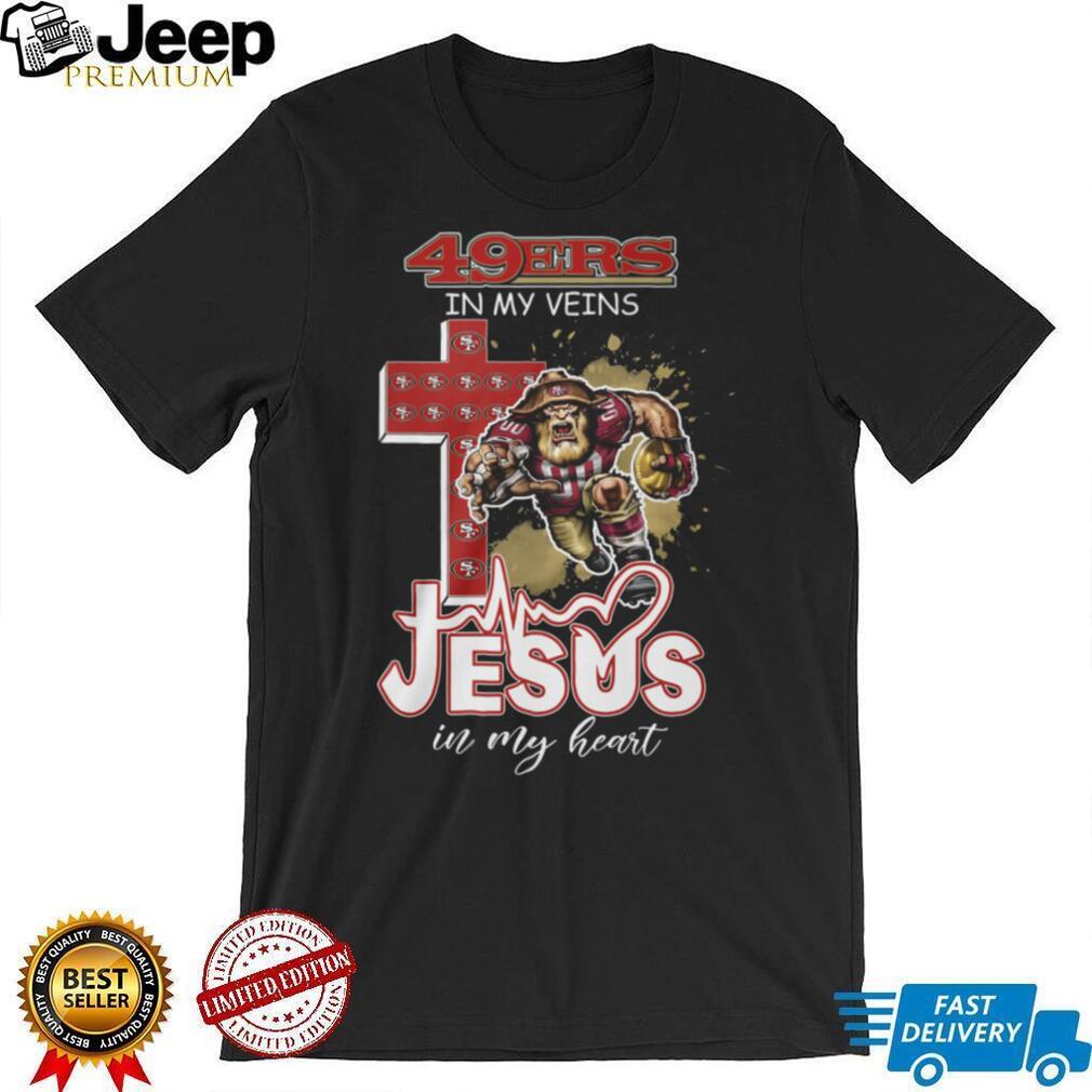 👕 About Game Day Devotion 49ers In My Veins, Jesus In My Heart T Shirt