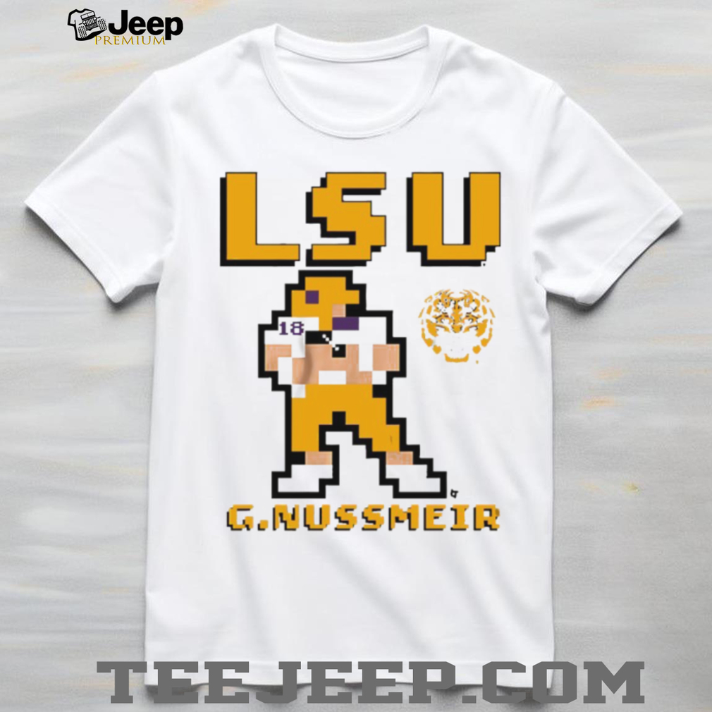 Show your support for Garrett Nussmeier and the LSU Tigers with this awesome retro-style t-shirt! Featuring an 8-bit design, this tee is a unique way to celebrate your favorite quarterback and team. If you’re a die-hard LSU fan, love retro gaming, and want a cool shirt that stands out from the crowd, this is the perfect addition to your wardrobe.
