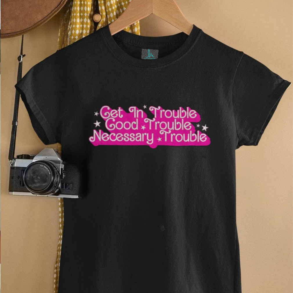 The design of this shirt would likely prioritize the text, ensuring the message is clear and impactful. The phrase “Get in trouble good trouble necessary trouble” might be presented in a bold and assertive font, possibly with emphasis on the words “good” and “necessary” to highlight the distinction. The design could also incorporate visual elements that symbolize justice, equality, or the act of protest and resistance. These might include raised fists, marching feet, or abstract representations of breaking barriers. The color palette could range from stark and impactful contrasts to more muted tones that convey a sense of seriousness and purpose. The overall aesthetic aims to be motivational and to inspire action.