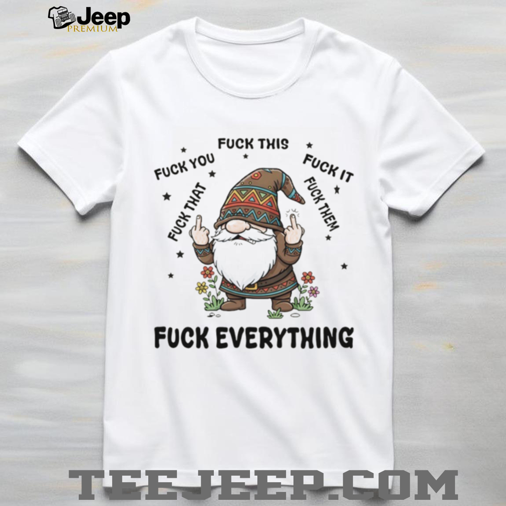 Ever had one of those days where you just want to throw your hands up and say ‘fuck everything’? This “Gnome middle finger fuck you fuck this fuck it fuck that fuck them fuck everything shirt” perfectly captures that sentiment with a hilarious, no-holds-barred garden gnome. It’s for the unapologetically blunt, the wonderfully sarcastic, and anyone who’s not afraid to let their clothes do the talking (loudly). If you appreciate humor that’s a little bit edgy and a whole lot funny, this tee is your new favorite way to express yourself.