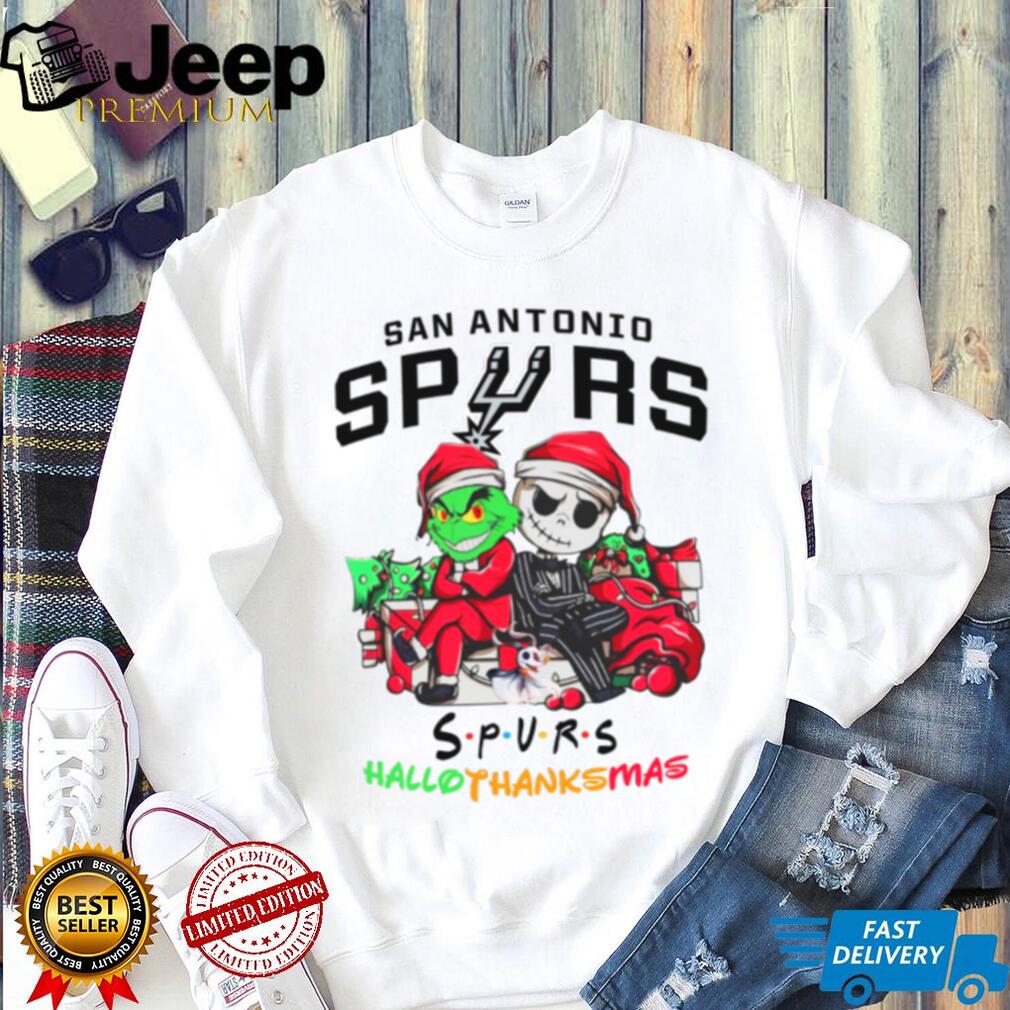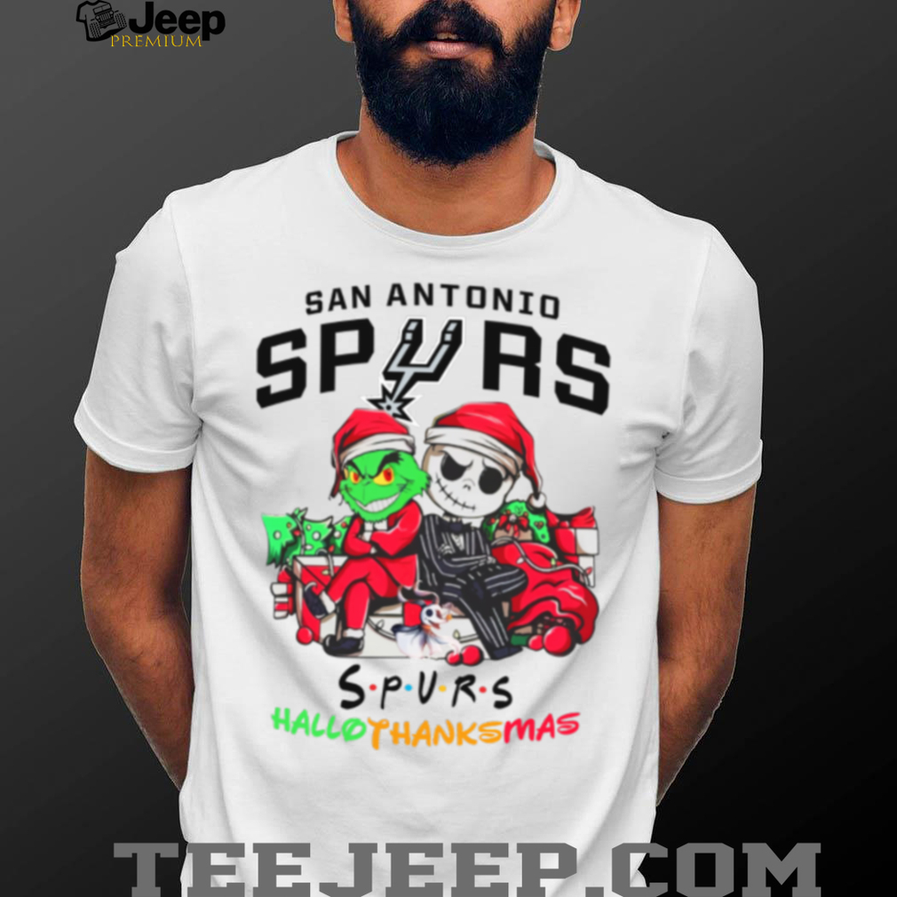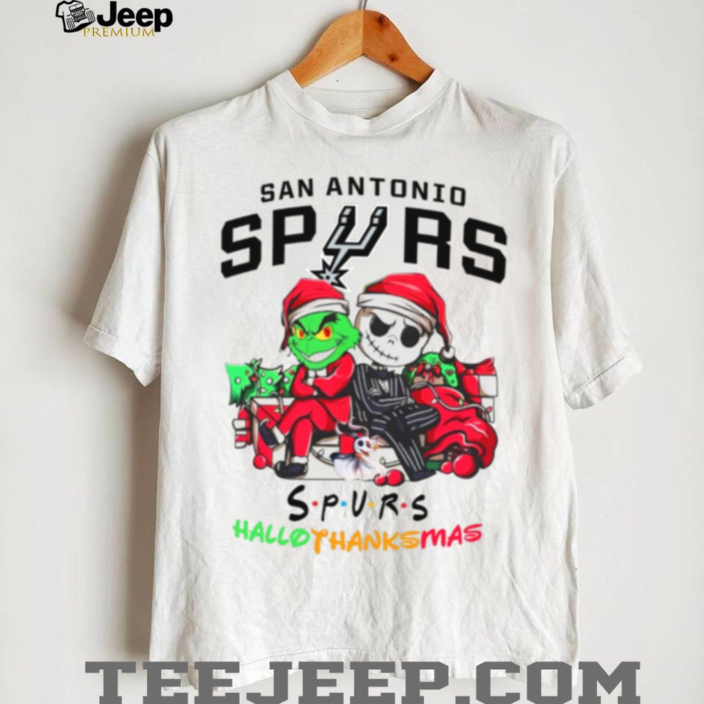 Imagine a holiday season where your favorite basketball team meets iconic characters in a festive mashup. This Grinch And Jack San Antonio Spurs Friends HalloThanksMas T Shirt brings together the mischievous Grinch and the Pumpkin King, Jack Skellington, cheering on the San Antonio Spurs in a design perfect for the entire holiday stretch. It’s a playful and spirited way for fans to show their team pride from Halloween all the way through Christmas. This shirt is for anyone who loves unique holiday style combined with their passion for San Antonio basketball.