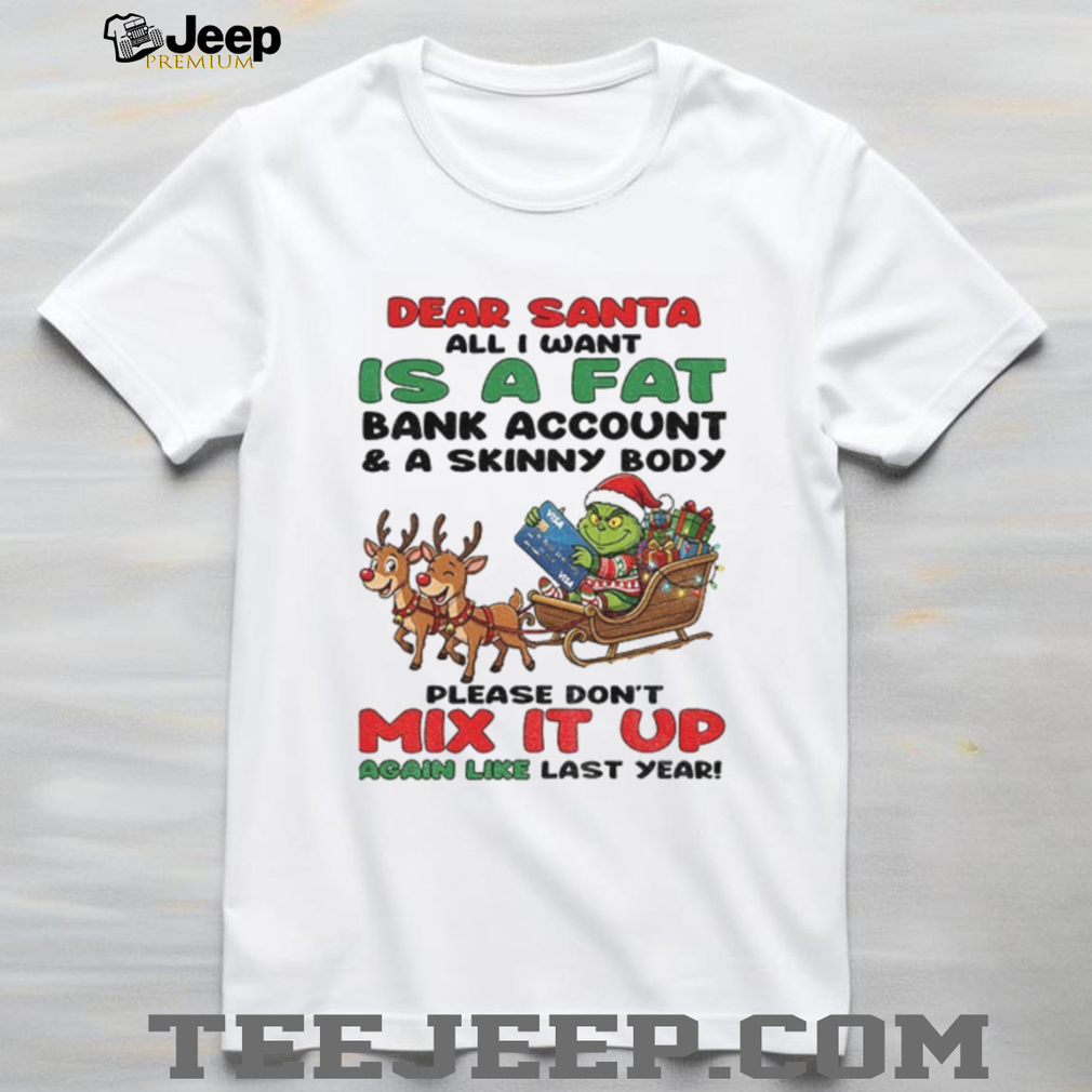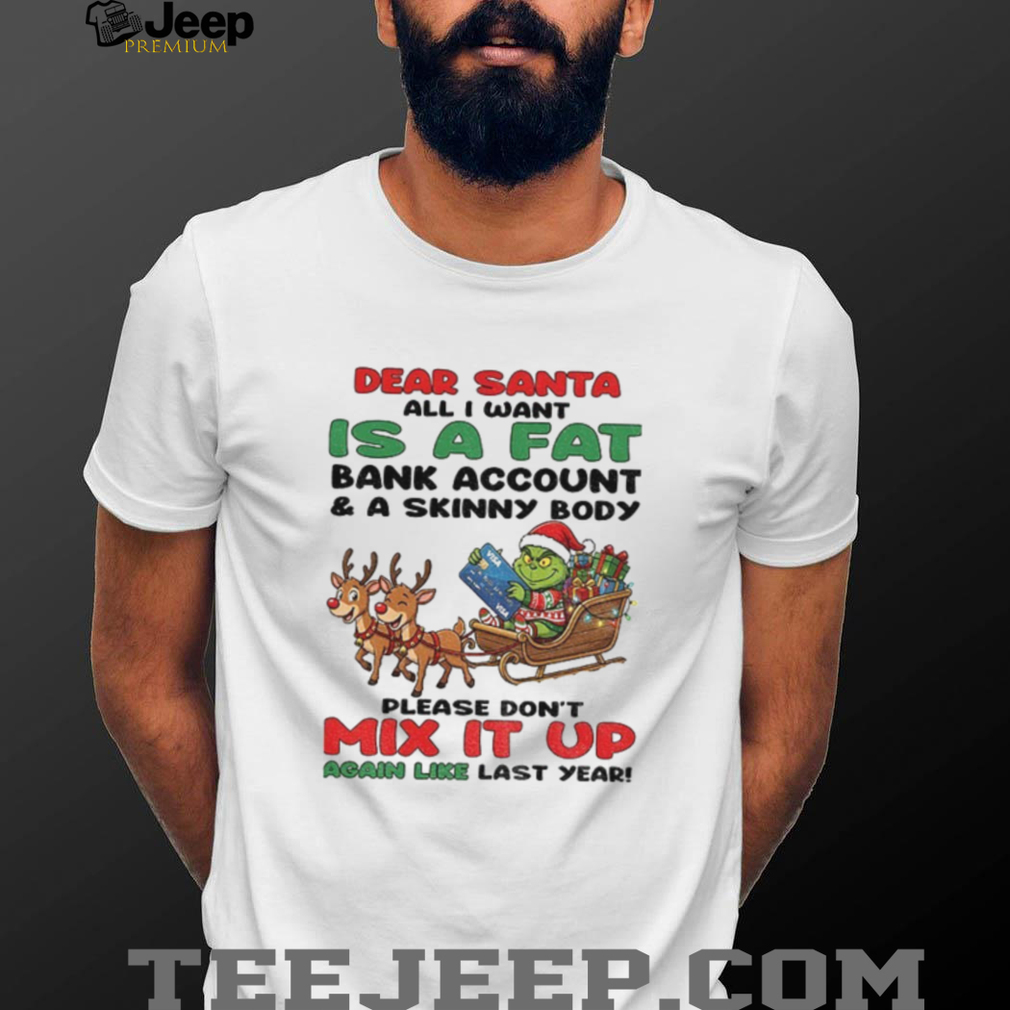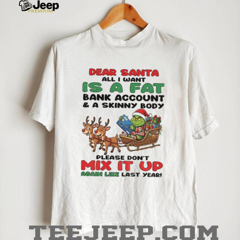 Dreaming of a Christmas miracle? This Grinch “Dear Santa, all I want is a fat bank account and a skinny body. Please don’t mix it up!” Christmas shirt speaks your mind! It’s the perfect way to express your holiday wishes with a touch of Grinchy humor.