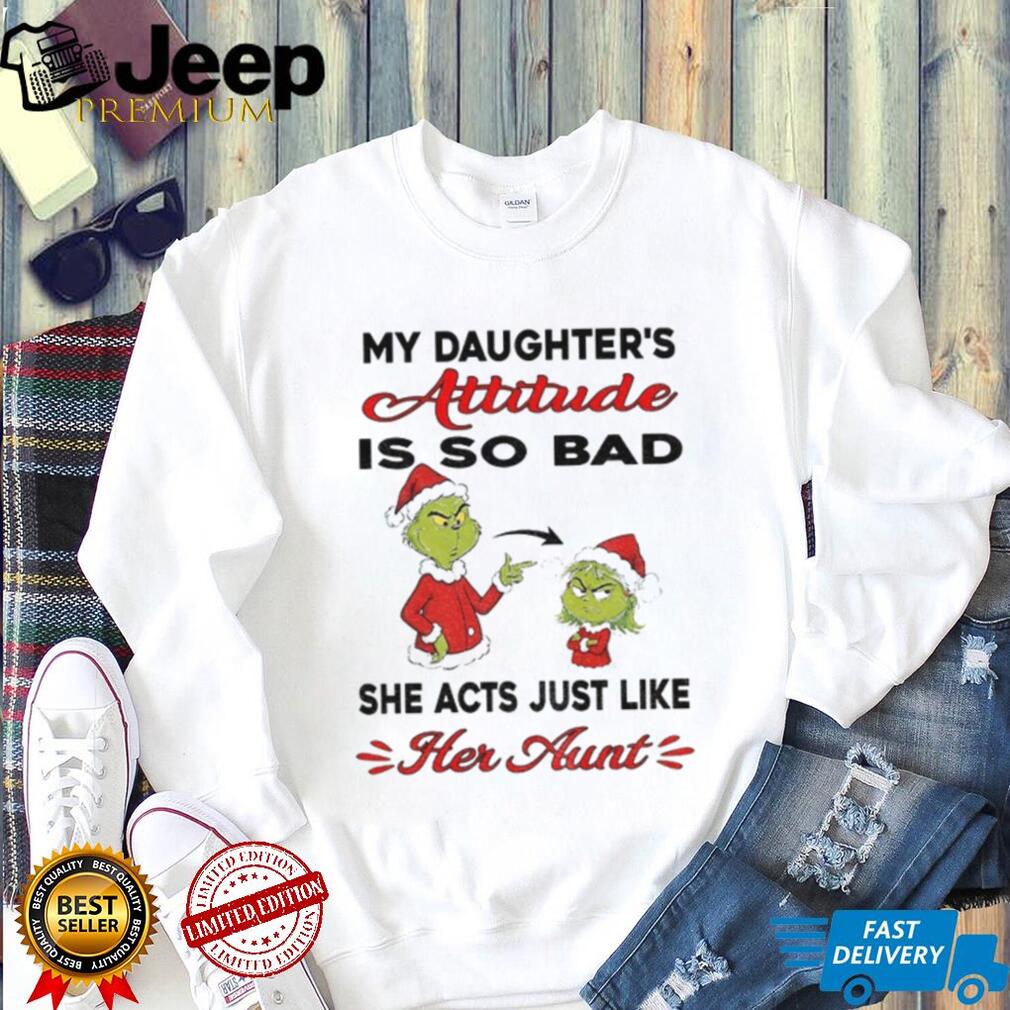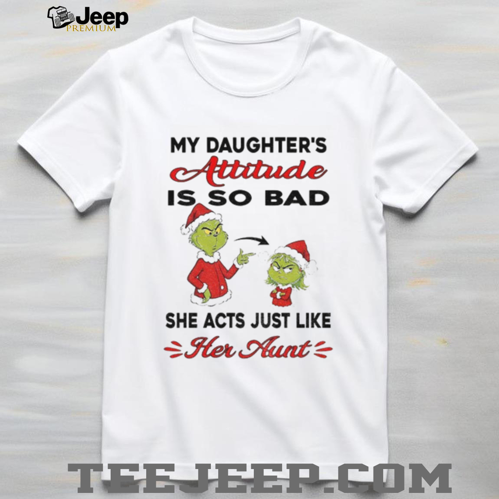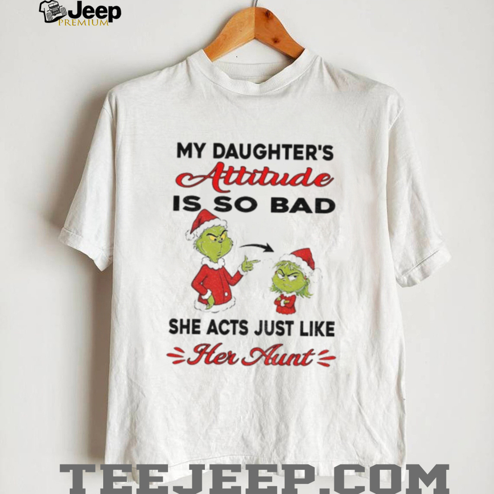 Does your daughter have that special “Grinchy” charm during the holidays? This “Grinch my daughter’s attitude is so bad she acts just like her aunt” Christmas shirt is a hilarious way to embrace it! Perfect for parents who can laugh at the craziness of family during the Christmas season, this tee is sure to get a chuckle at your next holiday gathering.