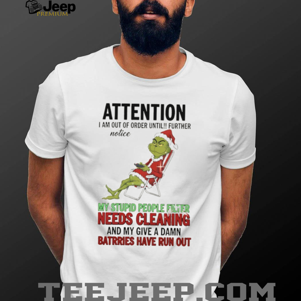 With each Grinch Santa attention I am out of order until further notice my stupid people filter needs cleaning Christmas shirt, you are contributing to creating a green tree. To ensure your shirt remains a festive favorite, machine wash it cold with similar colors and turn it inside out before washing. Tumble dry on low heat or hang dry to preserve the print. Please avoid ironing directly on the design and do not bleach.