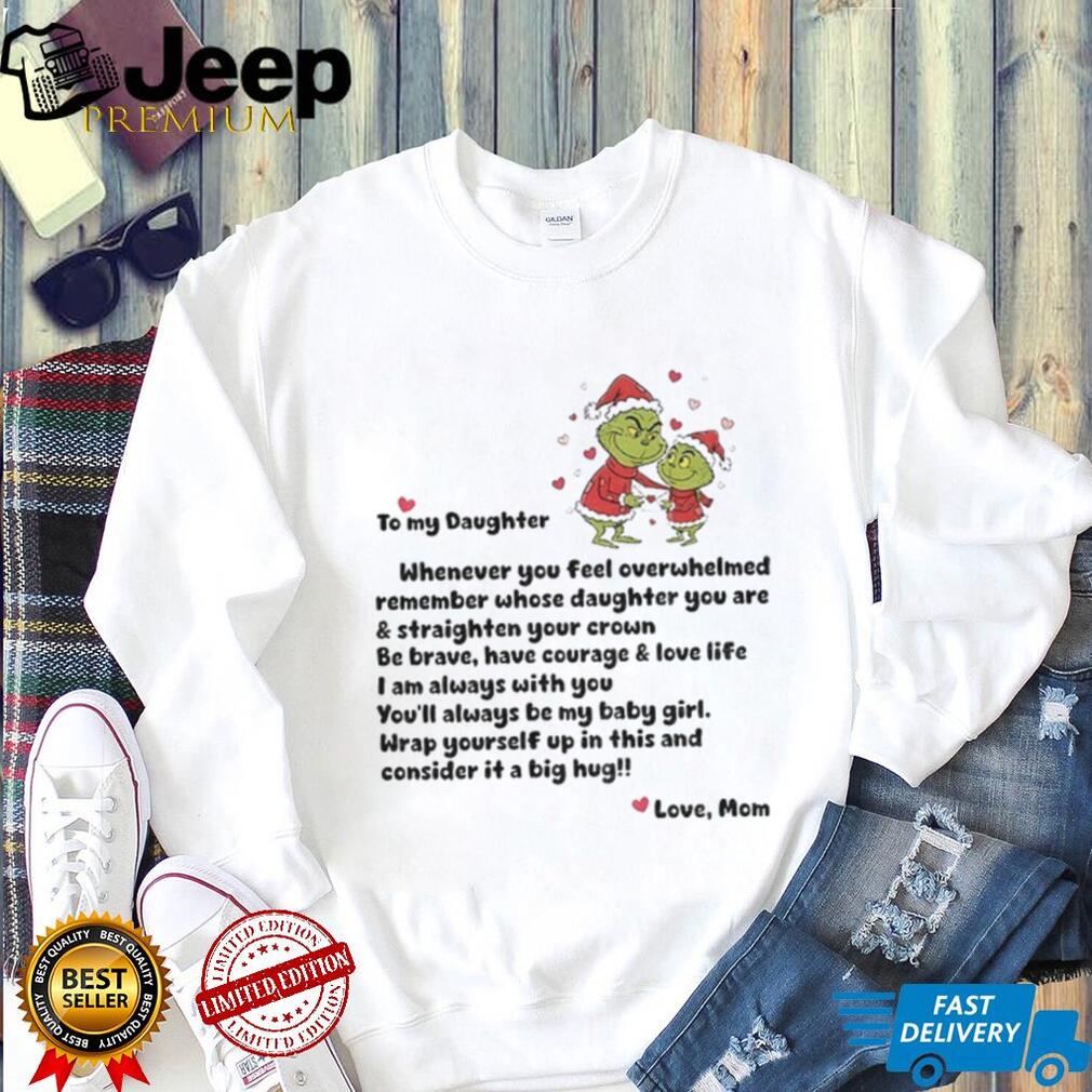 To keep your “Grinch Santa Claus to my daughter whenever you feel overwhelmed remember whose Merry Christmas shirt” looking great, machine wash it cold with like colors and tumble dry low. Avoid ironing directly on the design. Each purchase also helps plant a tree, making your thoughtful gift an environmentally friendly choice this Christmas.