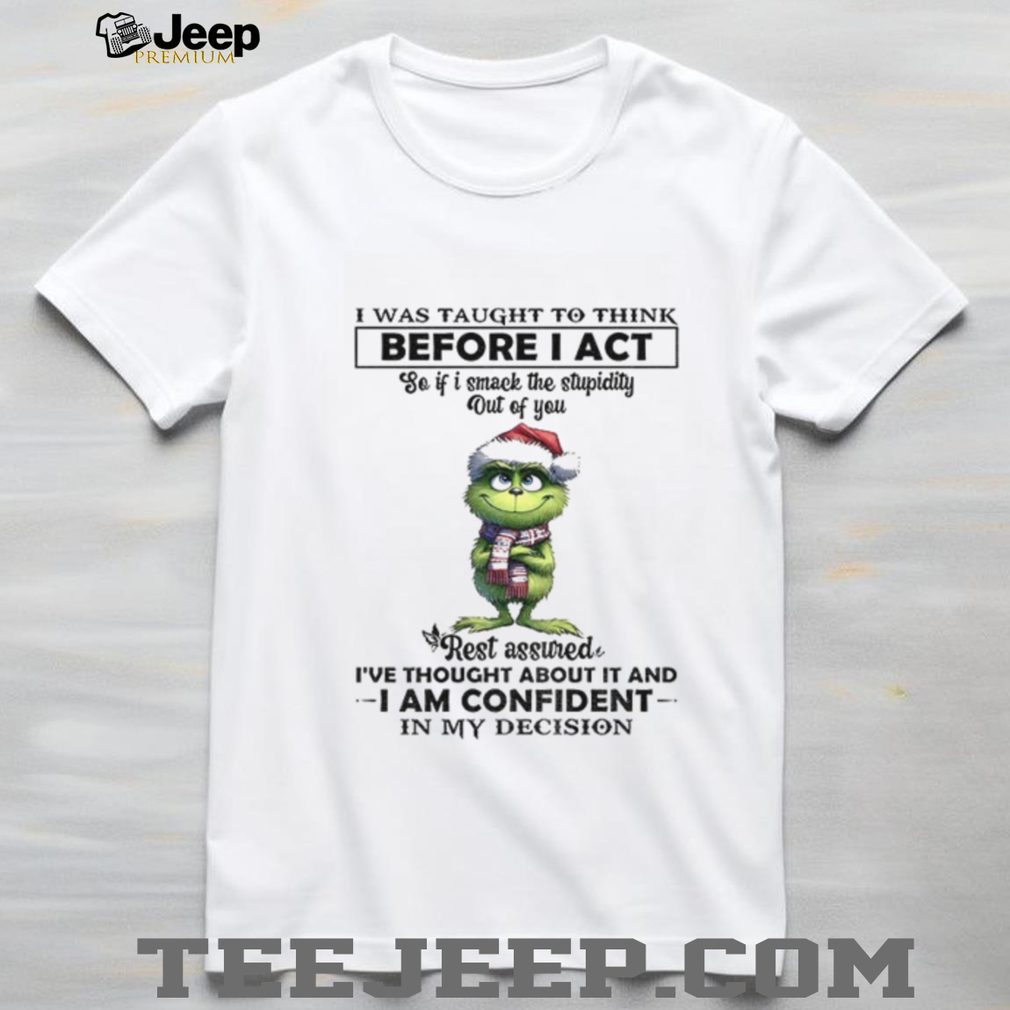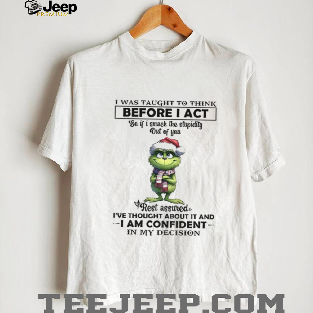 Get ready to spread some sarcastic cheer this holiday season! If you’re tired of generic festive wear and believe a good laugh is the best gift, then this “Grinch Santa hat I was taught to think before I act so if I smack the stupidity out of you Christmas shirt” is your perfect match. It’s a hilarious statement piece designed for those who appreciate witty humor and aren’t afraid to let their inner Grinch shine, all while looking festive.