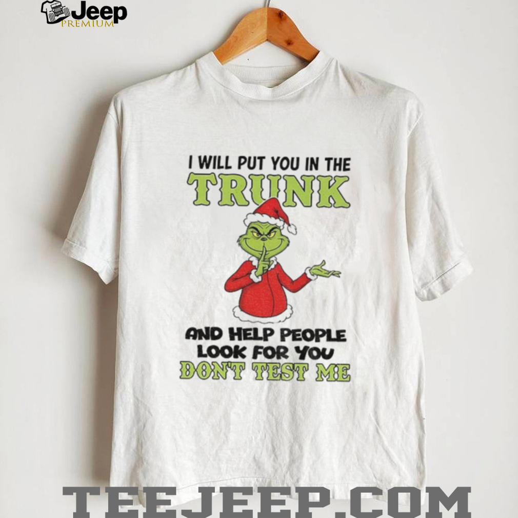 Do you have a dark sense of humor and a love for the Grinch? This “Grinch Santa hat I will put you in the trunk and help people look for you dont test me Christmas shirt” is perfect for you! This shirt is guaranteed to get some laughs (and maybe a few nervous glances) at your next holiday gathering.